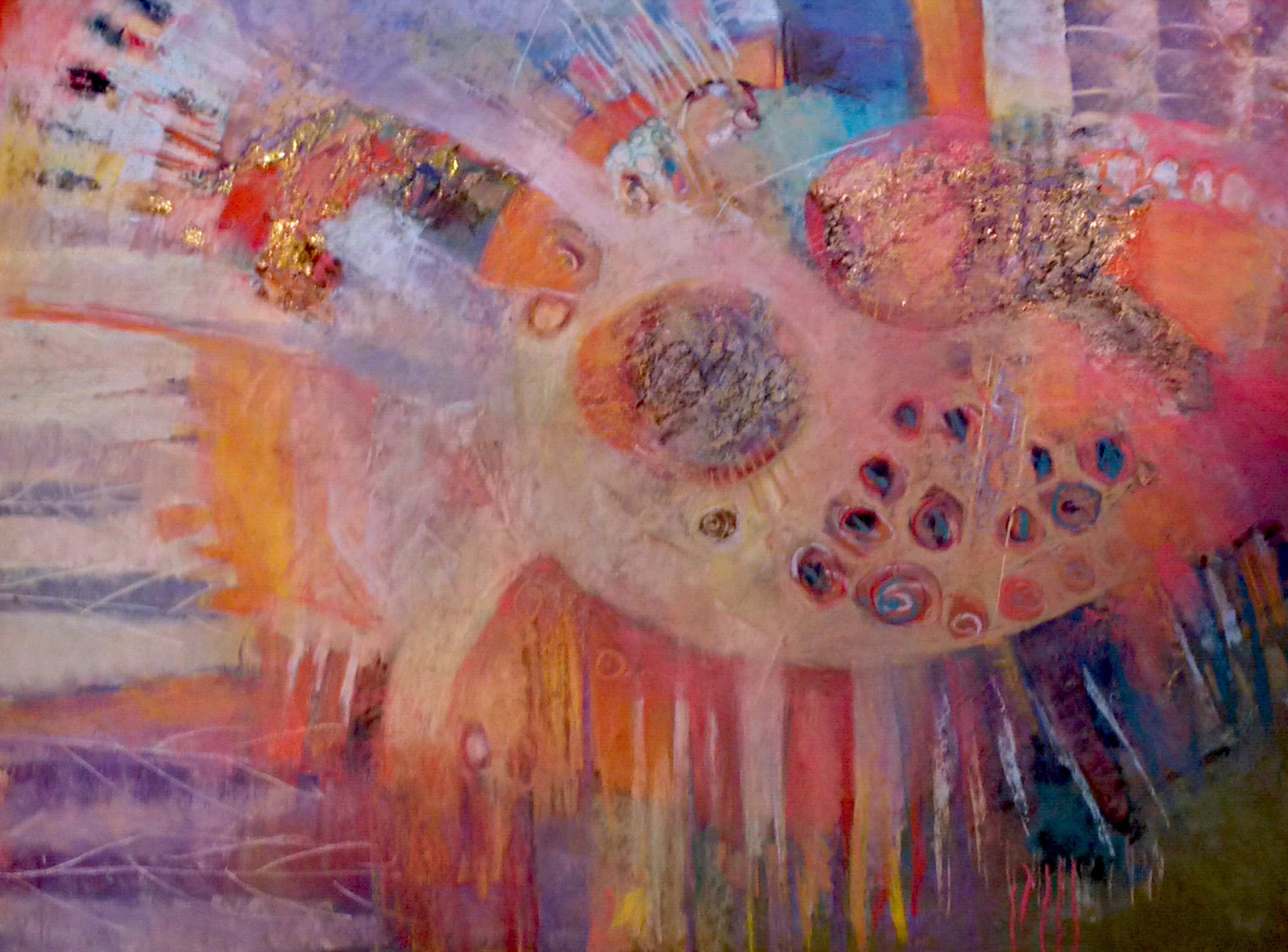 The painting holds a spiritual energy. My inspiration came from a watercolor I did in 1978. I saved this simple watercolor because I had recently begun to appreciate the power of color. I played with the underpainting, golden sheets glued to sparkle under the pastel, the journey evolved. I believed the universal Mother Earth is showing herself as a turtle and evolved in front of me. My husband sees a horse. Expressive-Abstract Art offers the viewer one’s personal vision and story. I painted a loving mood, a kindness I felt so long ago. The imperfections are key here. The energy flowed listening to Baroque music, which softened the gritty sounds of the pastels.