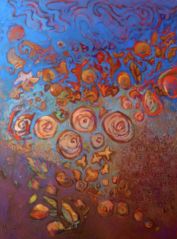 I really love Bernadettes work. They all inspire me in many ways. Her colors & patterns are luscious!!!! She says she loves flowers but these are no ordinary flowers. All of her paintings leave me both excited and pensive. In many ways they are very mystical and dramatic! ” Pastels Going Wild ” is a favorite of mine in this group.