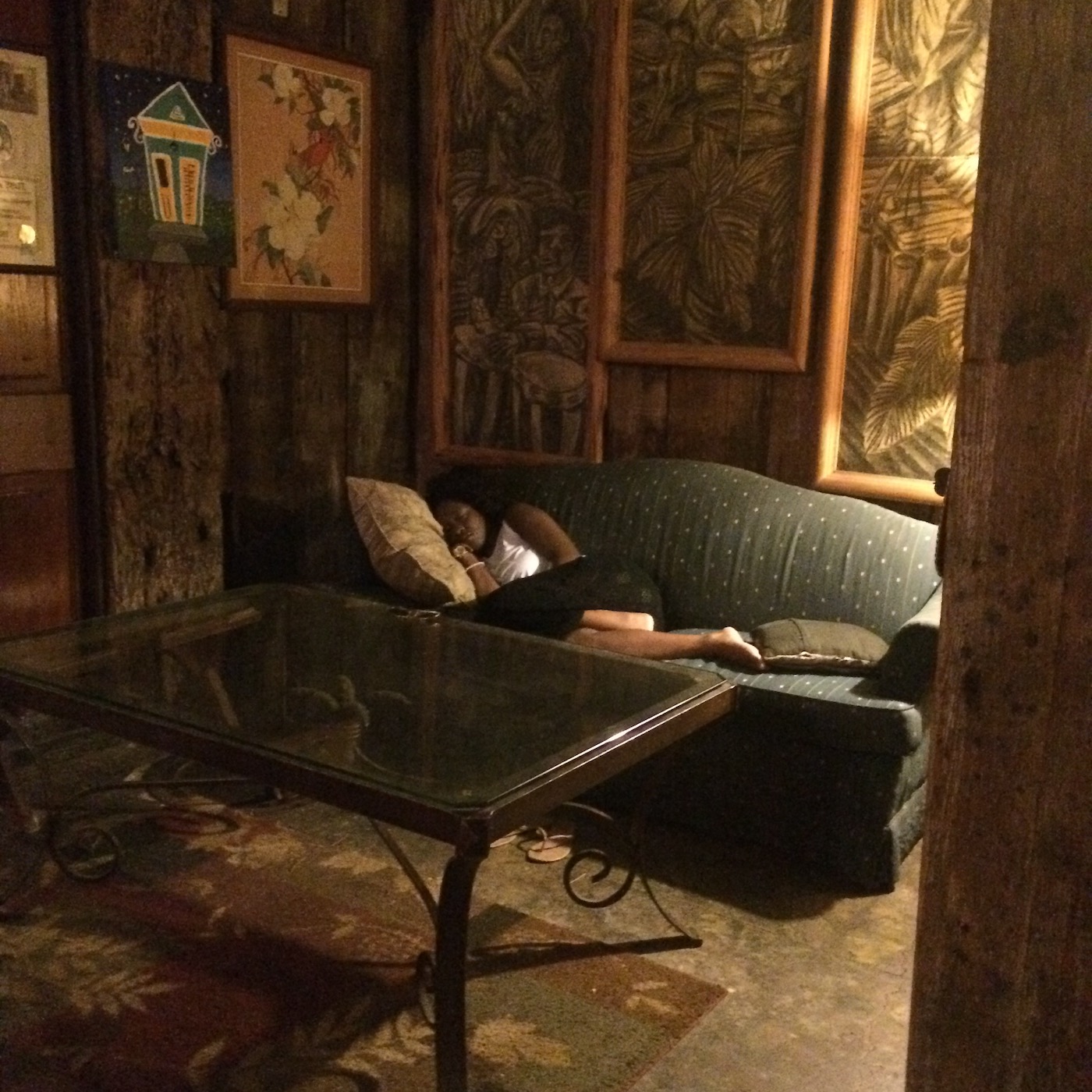 Going to a local old-style hippie coffeehouse/music bar Neutral Ground one night with friends, I “happened” upon this woman asleep on an old sofa in one of the small back rooms. What attracted me was not her, but the one incandescent light washing over this dark room, with dark furniture and dark paintings. She seemed so peaceful, the darkness enveloping and protecting her. I happened to have my cellphone, took a few shots, hoping they would be decent to “ bring me back to that time and place and spirit.” Often, I am not “looking” for inspiration.