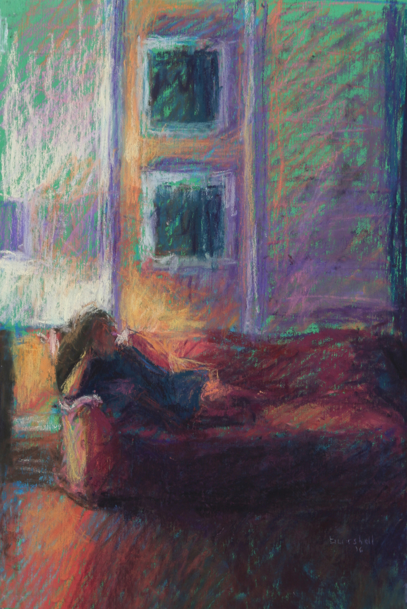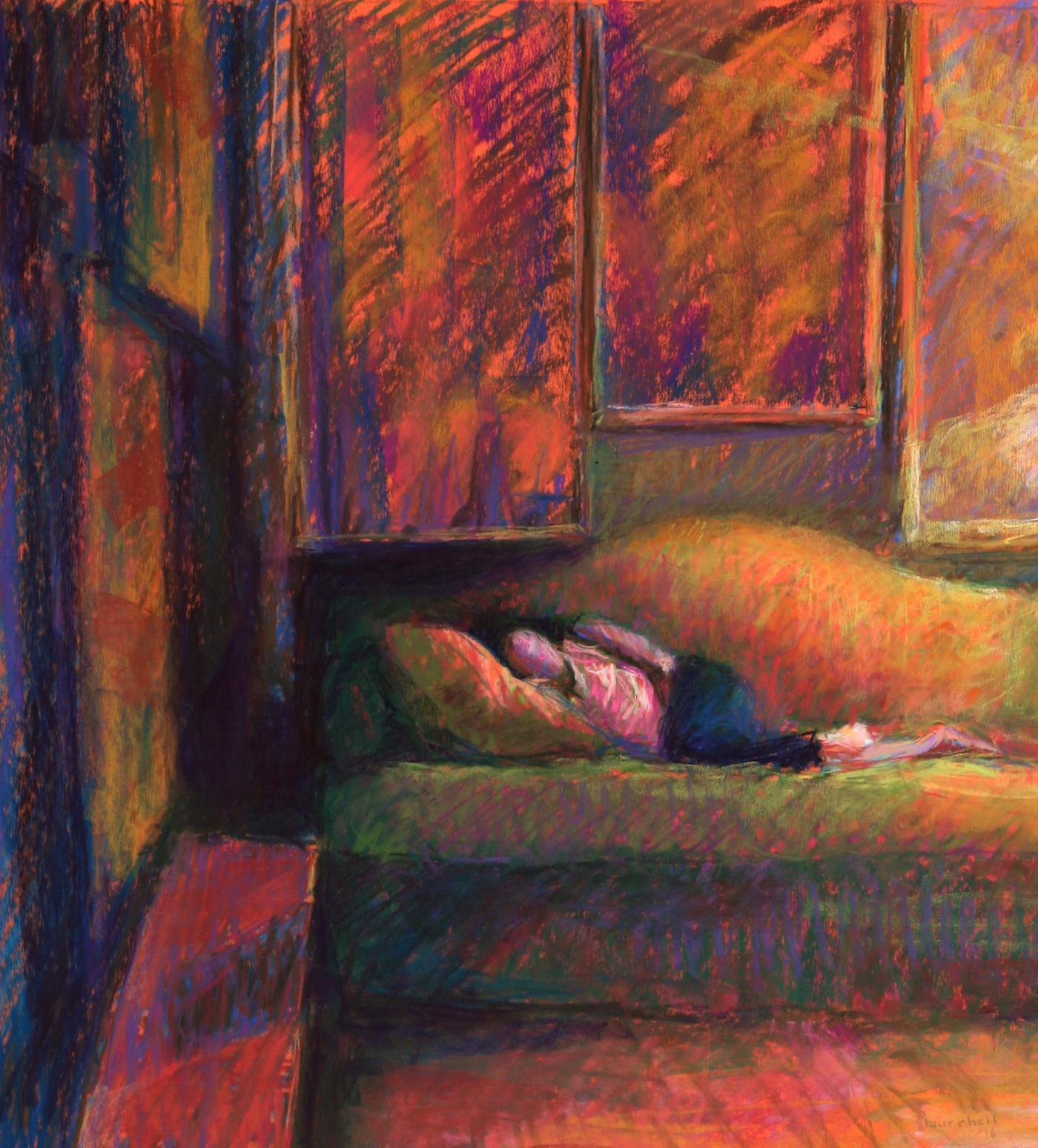 The overall warm, inviting feeling of this scene and the comfort of the figure was what I was trying to express, so I did not bring a lot of detail to her, just enough to put her as a gentle focal point.