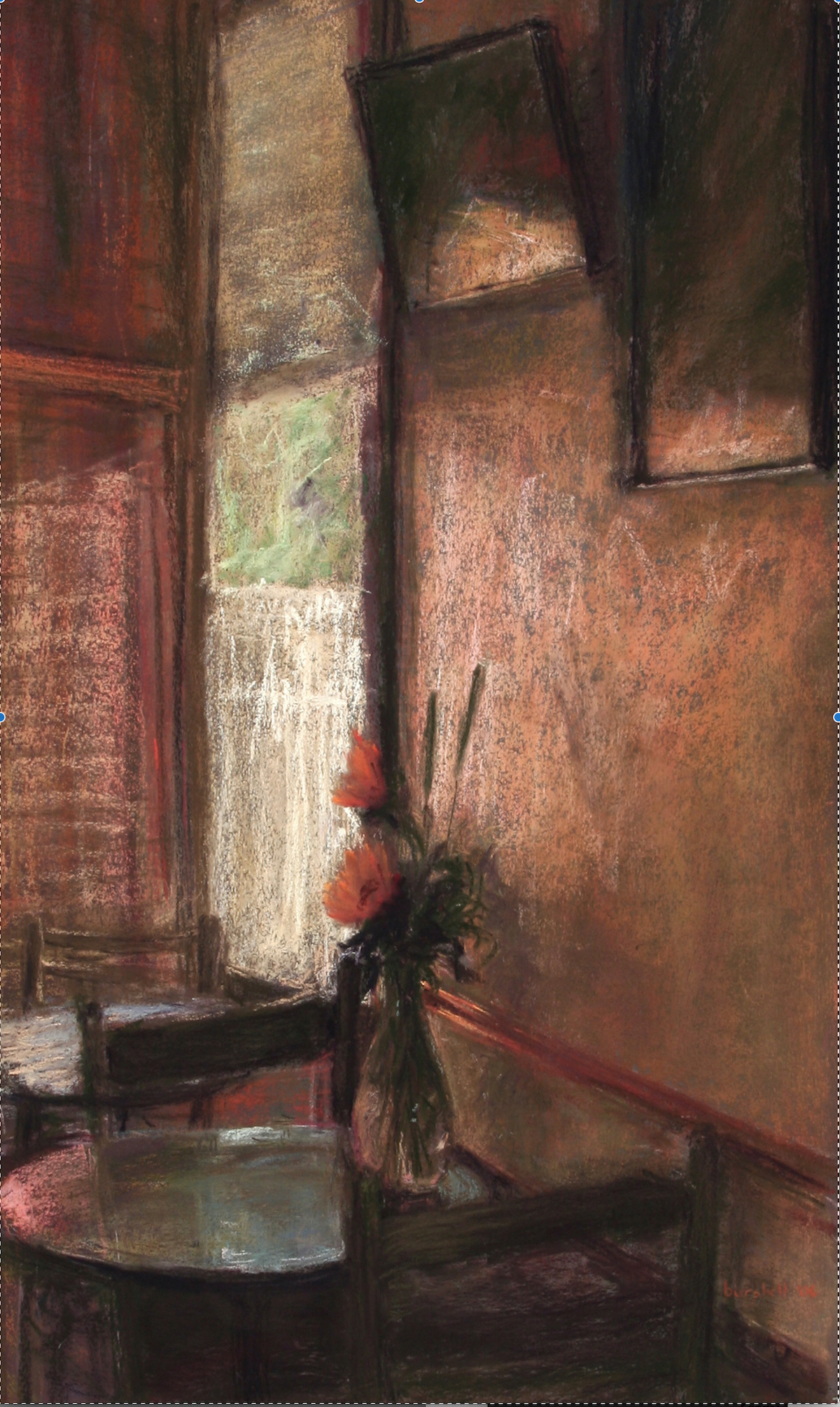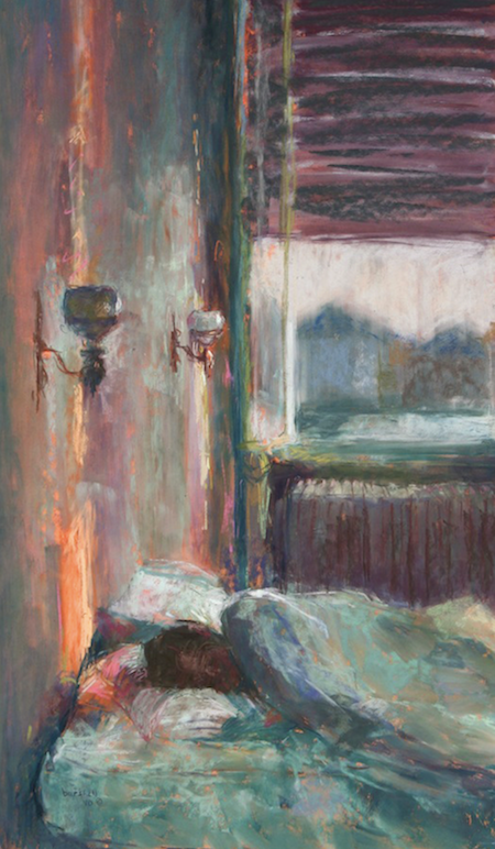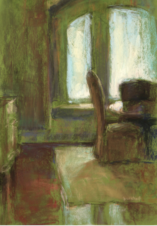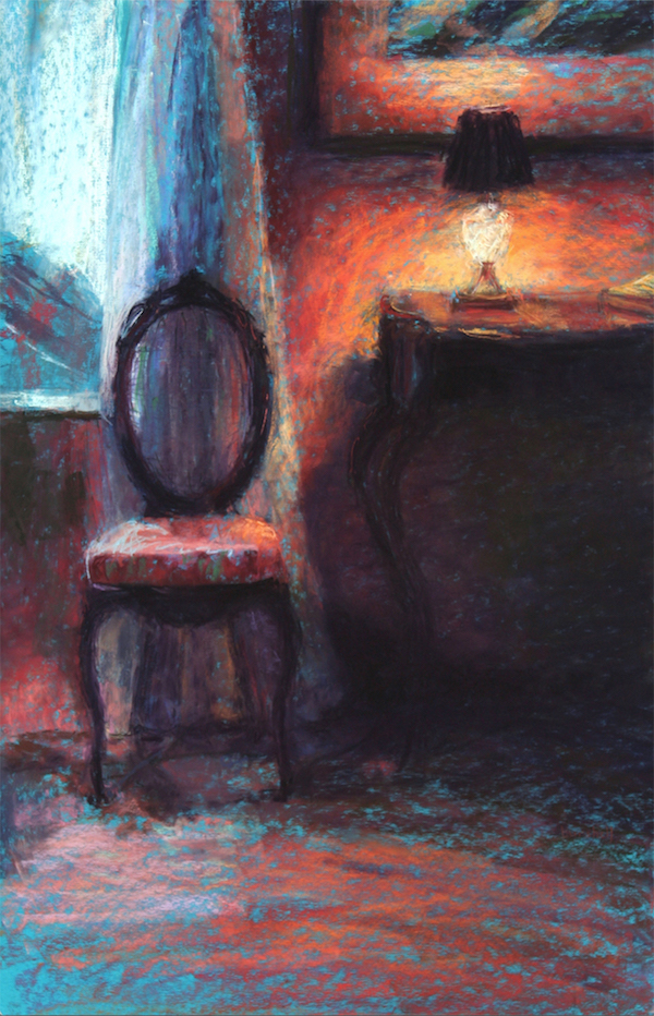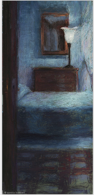 My original oil portrait/figure concentration slowly morphed into pastel interiors. I painted at home with young children, often sketching their rooms while they played there, often easy-to-find non-tidied up areas – unmade beds, sink filled with dirty dishes, morphing into similar subjects in friends’ homes, to stays at bed and breakfasts, on…. I have been doing my ROOMSCAPE INTERIORS for over 30 years! This was certainly not a conscious progression. Recently, I have slowly integrated the figure back, but aiming only to have the figure as part of the painting, not the ultimate object, raison d’etre.
