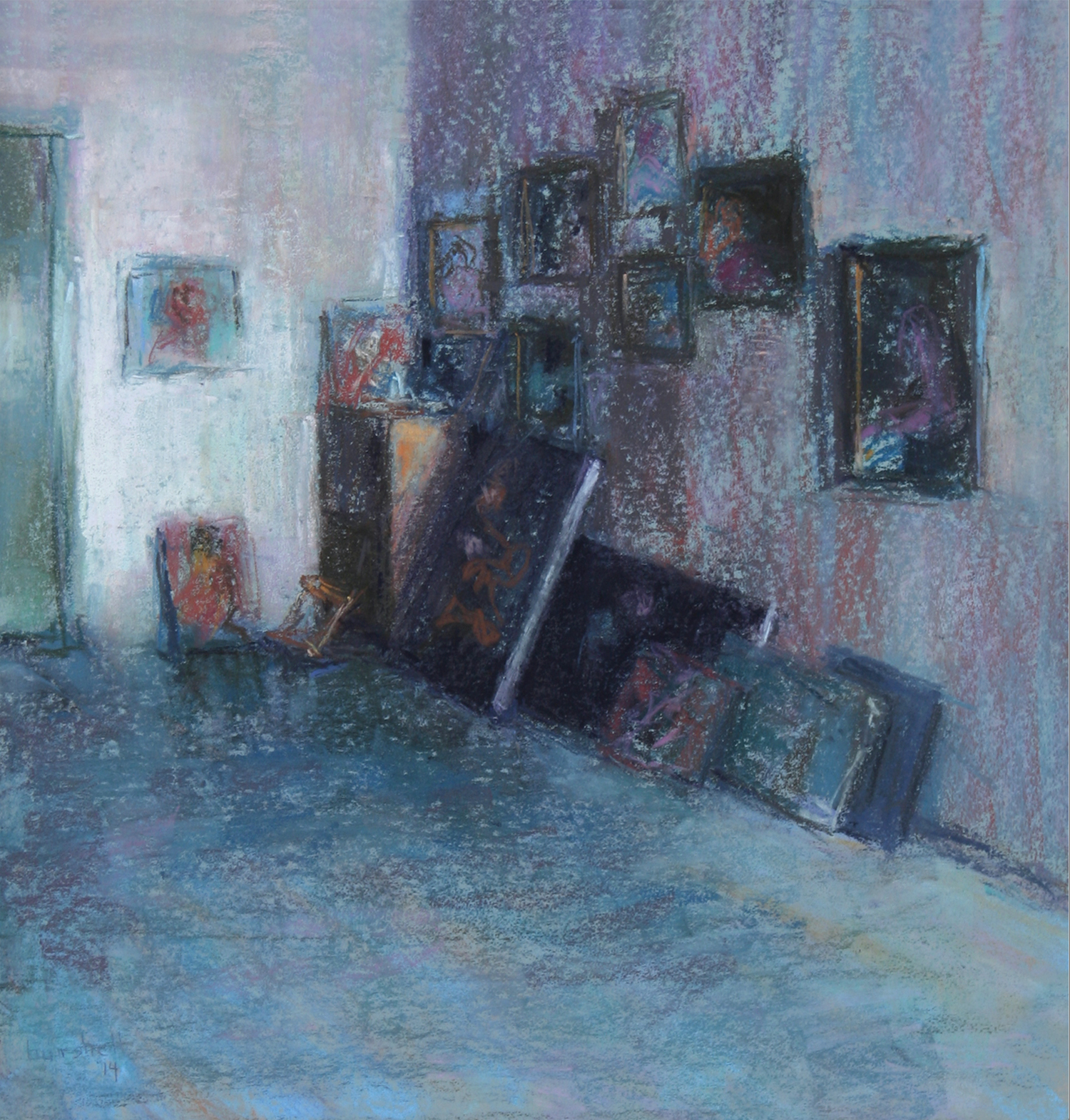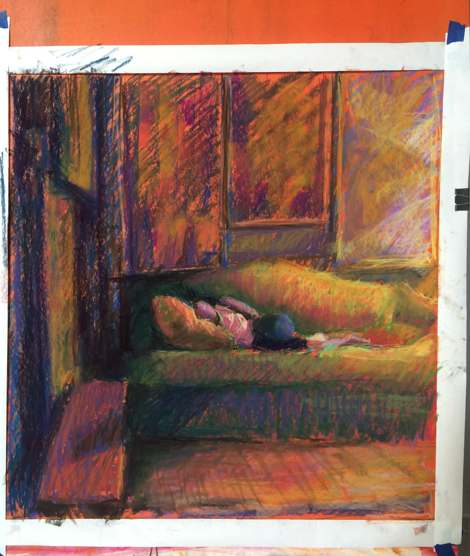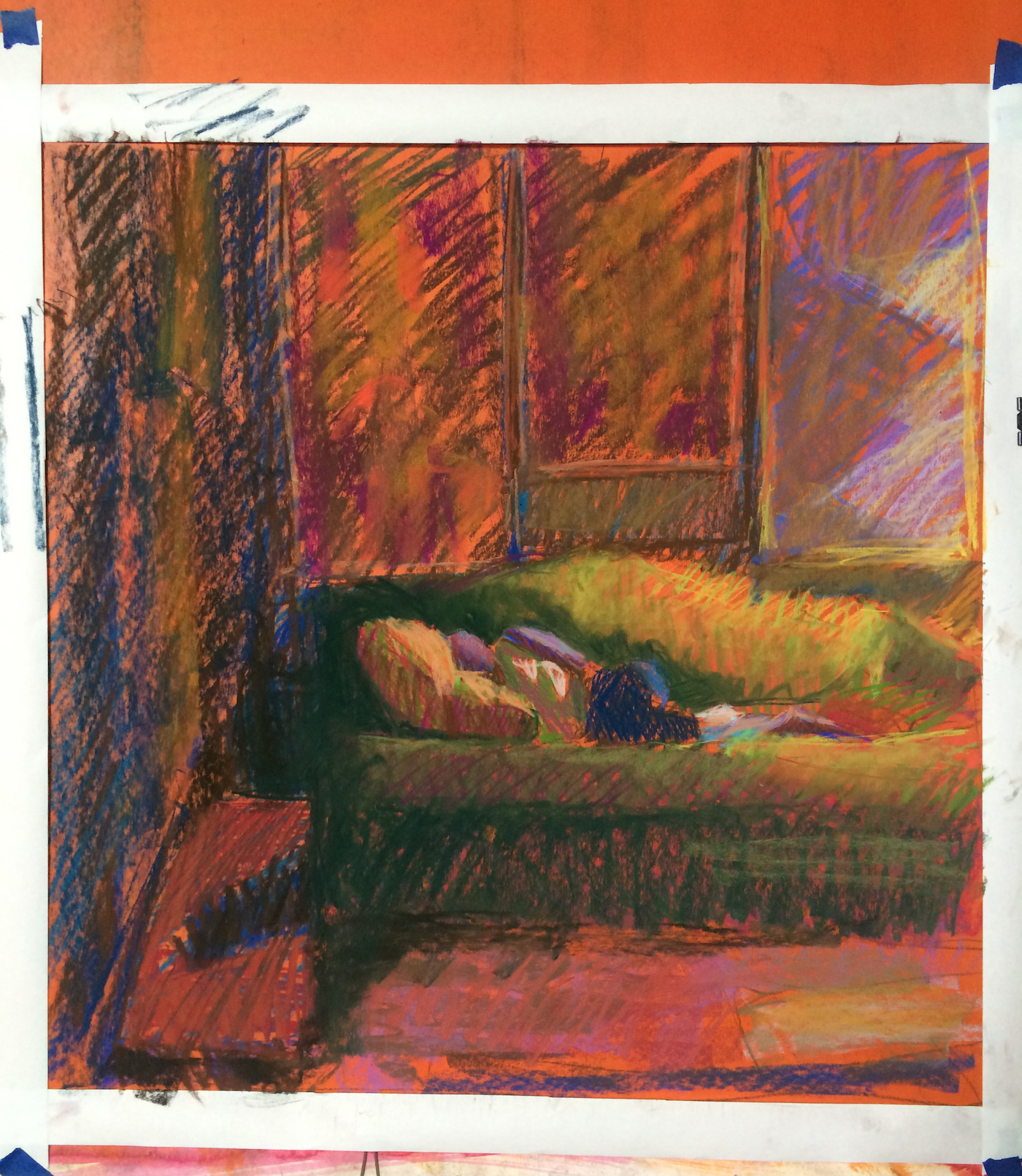 I cropped some of the right side because I thought the shape of the vertical paintings repeated too much and I also did not feel the right side of the sofa needed to be included. I maintained cross-hatching texture in some parts, while I dragged my pastel over the paintings and the floor for some simplifications and unity.