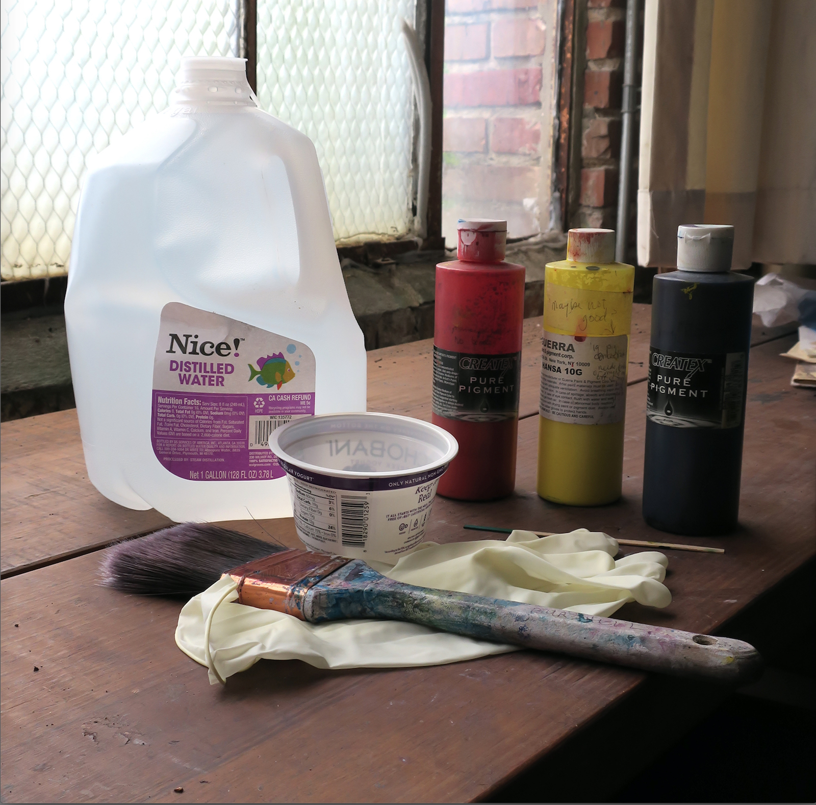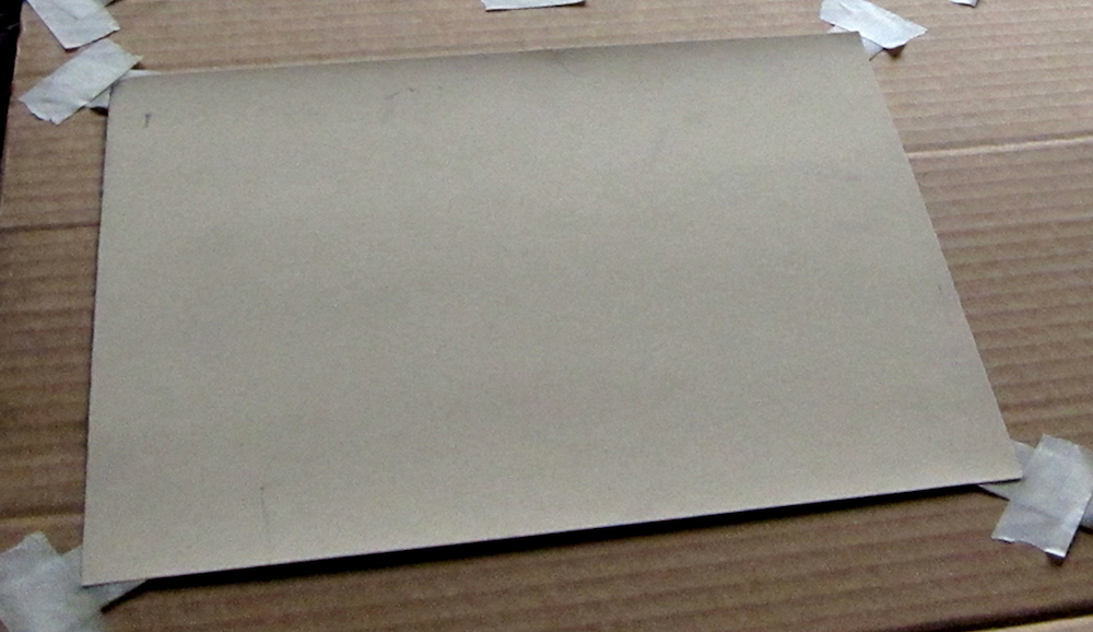 I mixed a primary red and yellow Golden Transparent Airbrush Colors (now discontinued, but other pure pigment colors can be used) and apply with an old hardware store painting brush (the surface of the paper will eat up the bristles). Keeping the paper flat, I apply it one layer in one direction, let it dry, then add a layer in the other direction.