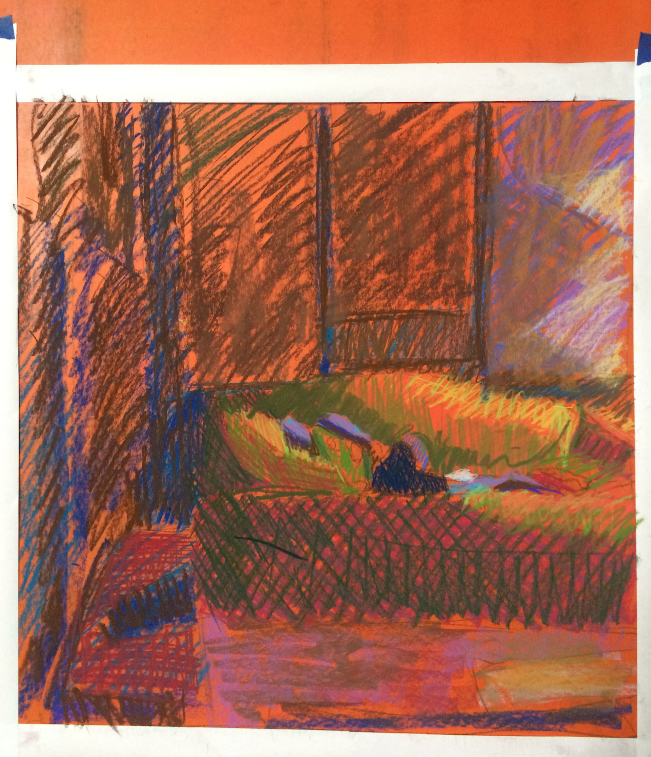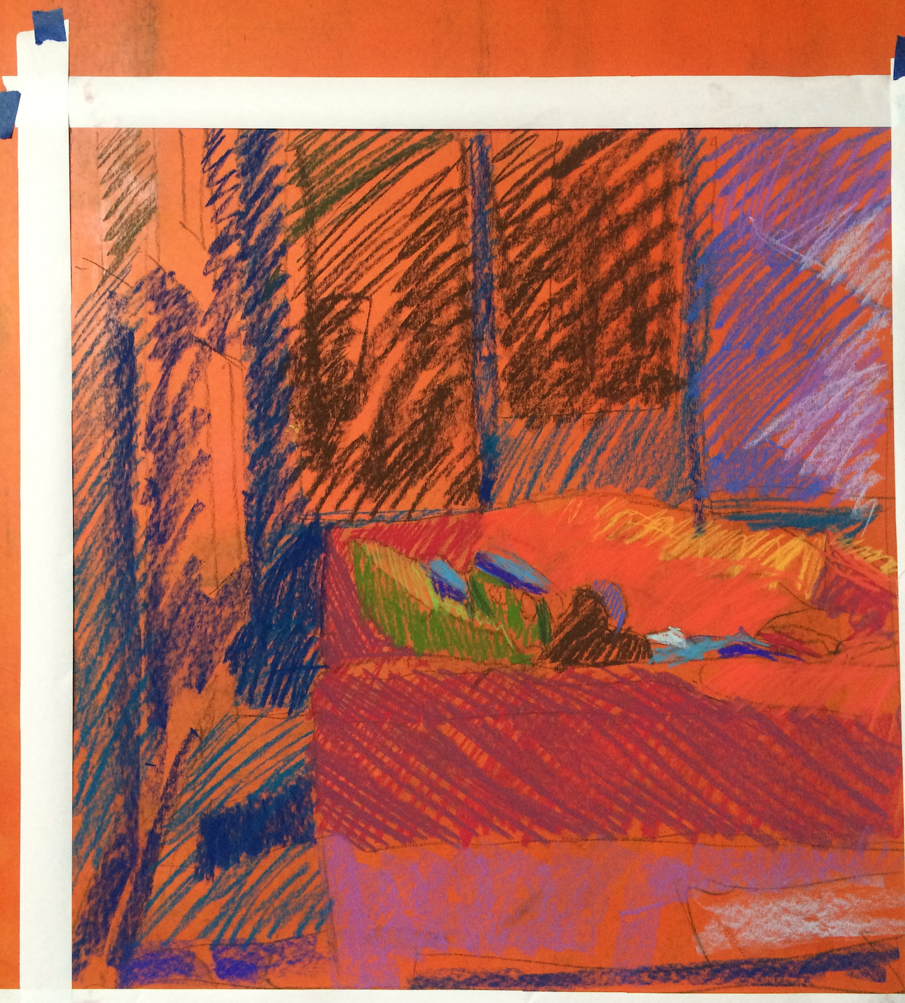 Planning on the work to be in cool, dark olives/blues/purples, I chose to tone a UART 500 sanded pastel paper in a bright orange. If the overall scene is to be warm, I might tone the paper a cool color, often the opposite on the color wheel – the complementary tonal color often will make the final colors “pop” if it shows through.