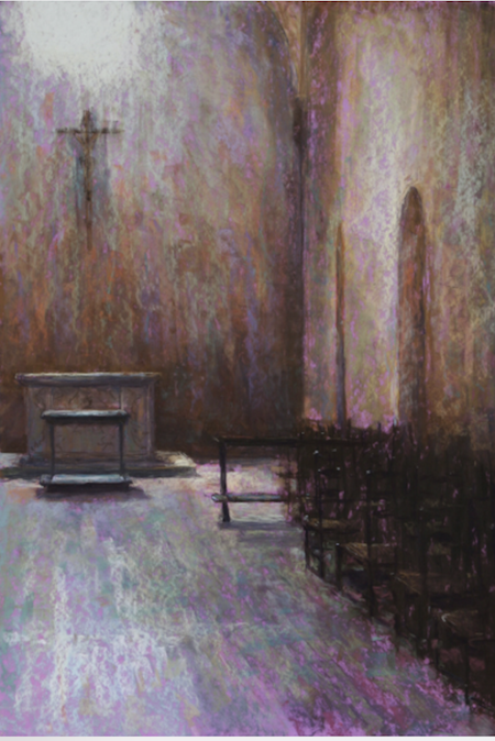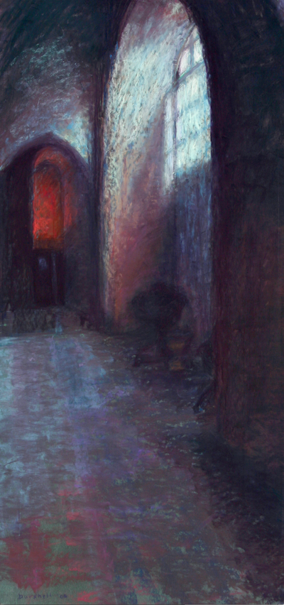 The pastel “Warm Glow on Chartres,” is another example of my toning of my sanded pastel paper with the complement of the eventual work. I toned the background turquoise blue, having planned that the final work would be a warm red/orange; by letting the cool background color show through, the warms looked even warmer, the red/oranges more intense against the complement on the color wheel. I left enough of the background color to show through as well as the cool light coming in through the window to balance all the warms in this pastel.