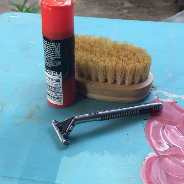 What to paint? It was my honey’s Cam’s body brush and shaving things that caught my eye this time and I thought, what the heck. So I set up the items on a table outside.