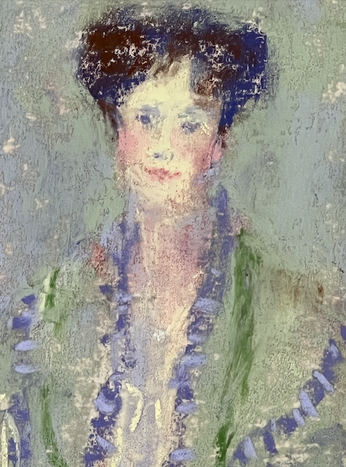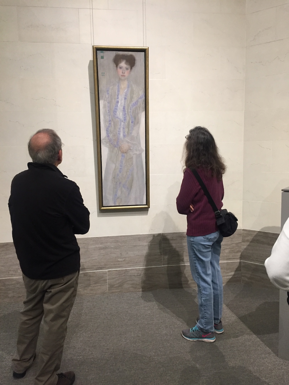 Here’s the reference photo that I took at an exhibition of Gustav Klimt’s work at the Legion of Honor Museum in San Francisco. It’s of Klimt’s “Portrait of Gertrud Loew.” I decided to leave out the man to the left and concentrate on the Klimt painting and its relationship to the woman looking at it.