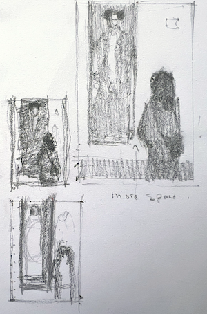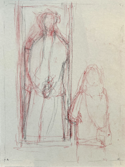 I drew up the piece in a red pastel pencil and then went over the figure of Gertrud with an HB pencil.