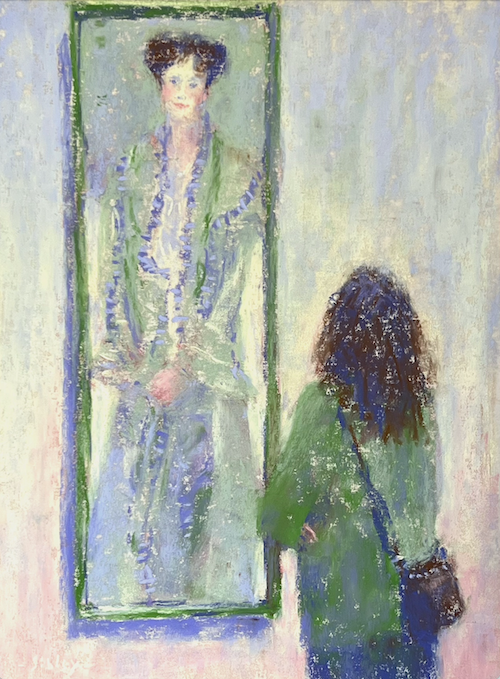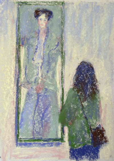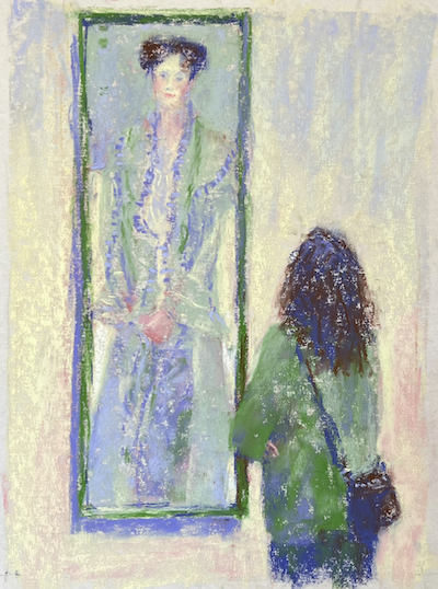 Yes! I love the term Creative Dormancy. In fact I have a box full of dormant paintings! The subtle changes you made definitely help the painting to finish. I do wonder if you had a reason for changing temperature/value of the viewer’s sweater right at the strap line of her purse? On such a small piece, it’s not so noticeable, but when you zoomed in…Just curious.