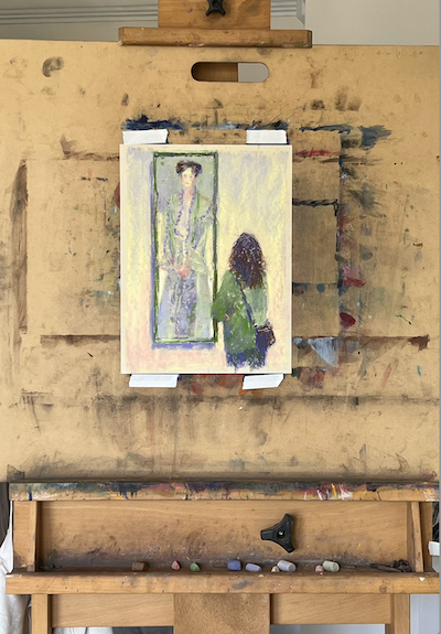 So I went about cooling the wall alongside the painting and greying the light areas in the painting alongside the figure. I also softened the edges of the dress.