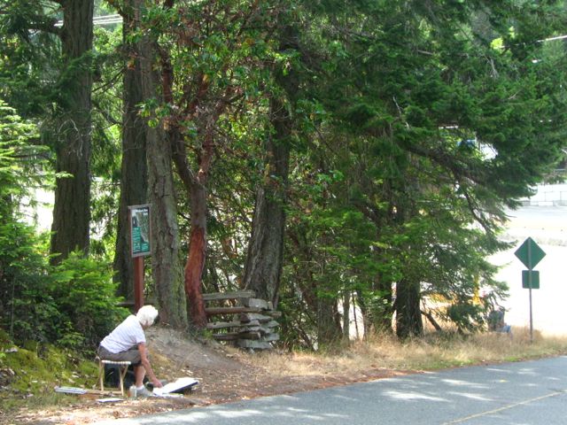My Mum, Dad and I went out painting in July. Unusual for us, this was an afternoon outing (rather than a morning one). Since we would start losing light, we didn’t want to spend a whole heap of time looking for a spot so we settled on parking at the Long Harbour ferry terminal. There was water, trees, and buildings to choose from. Even so, I had a hard time committing to a scene. And then I turned around and saw this: