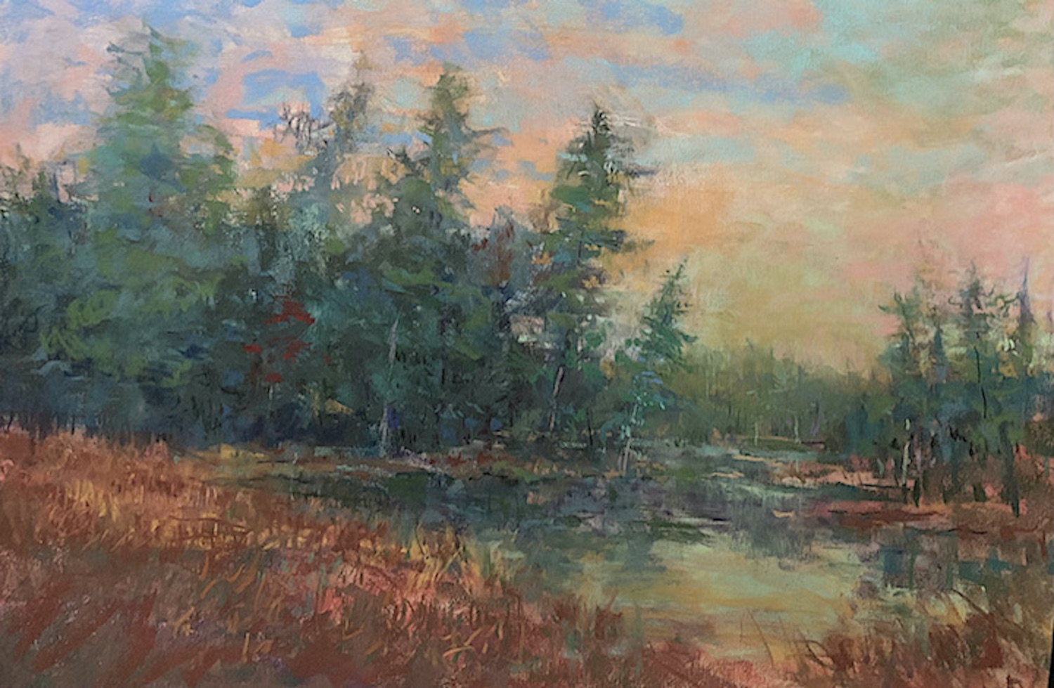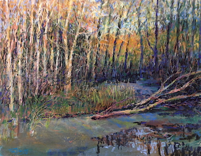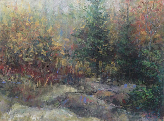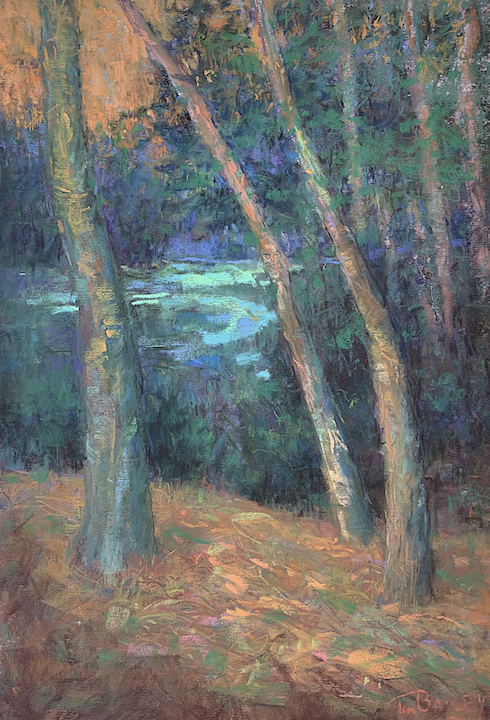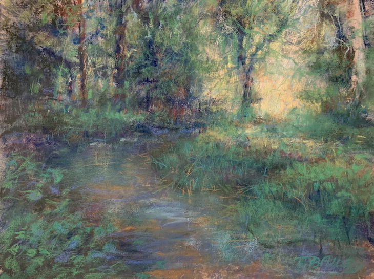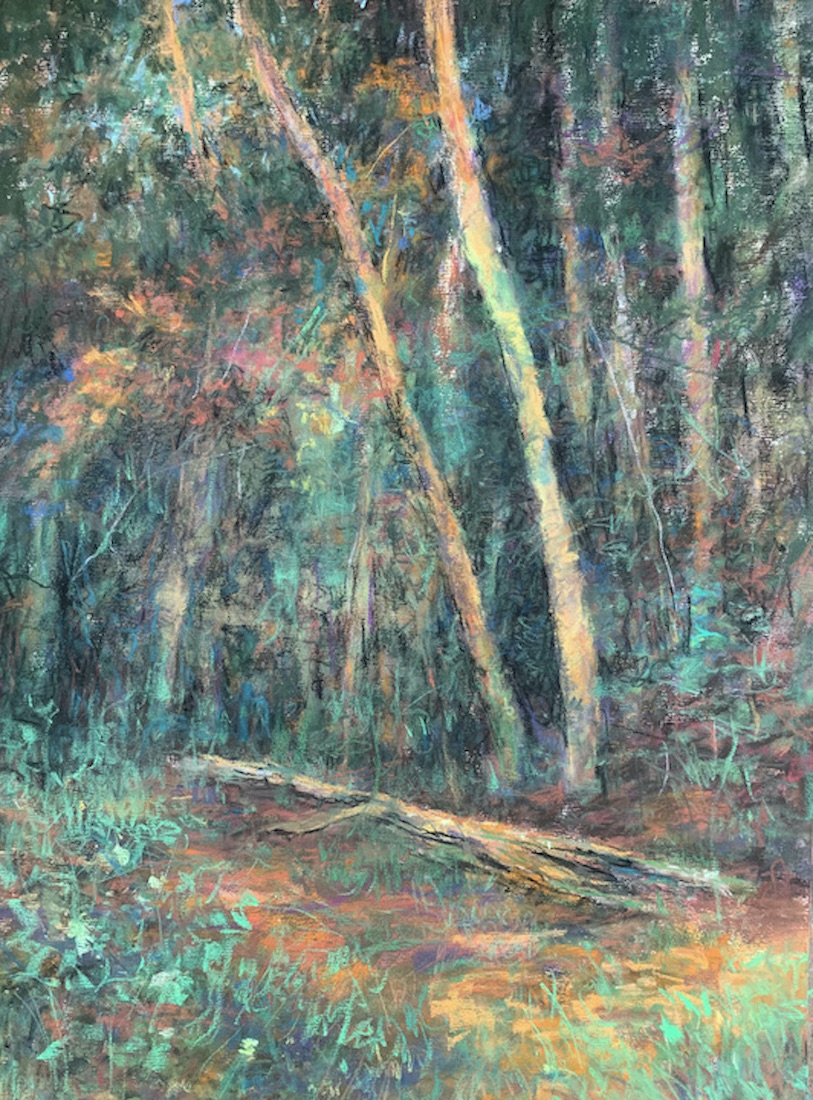 Dense woodland interiors, flowing rivers, streams and lakes are common themes. Dappled sunlight streaming through a canopy of pines inspires me every time. If I see a hint of mystery, perhaps a warm glow from just up the path or around the bend I’m already opening up the pastel box.