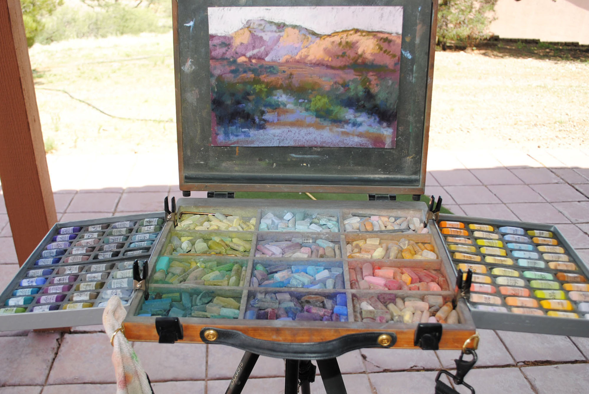 I have been through many different versions over the years, and at present I’m using an All-In One pastel box that accommodates my papers, so no boards necessary. My particular box will only hold the thinner sticks, so I bring other small sets of the chunkier pastels. My tripod, a Sienna, clips on the bottom, to which I’ve attached a rock bag. (We do have strong winds here in the high desert!)
