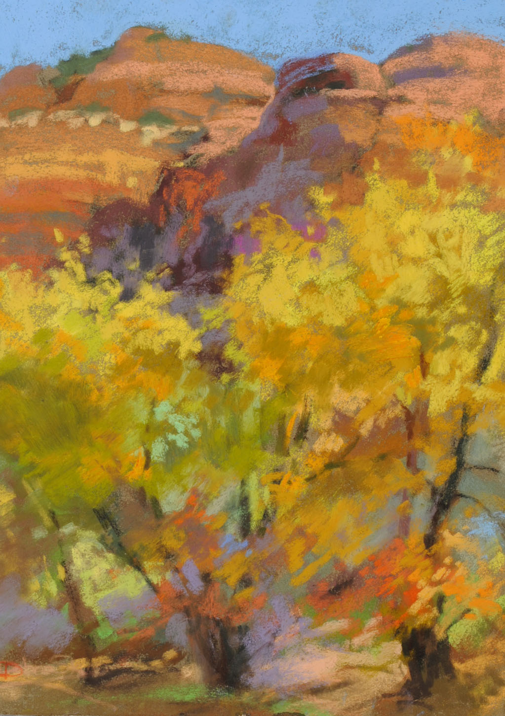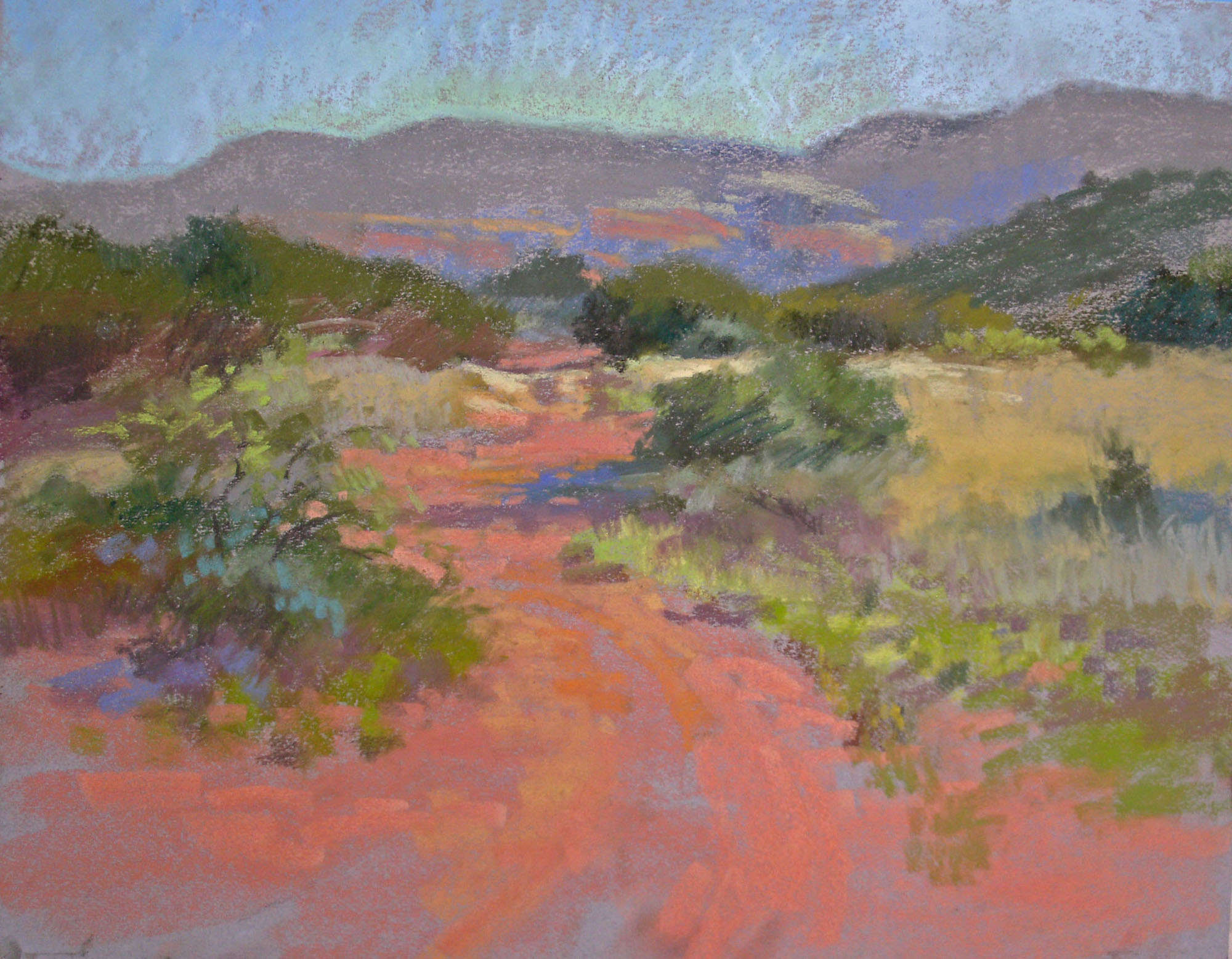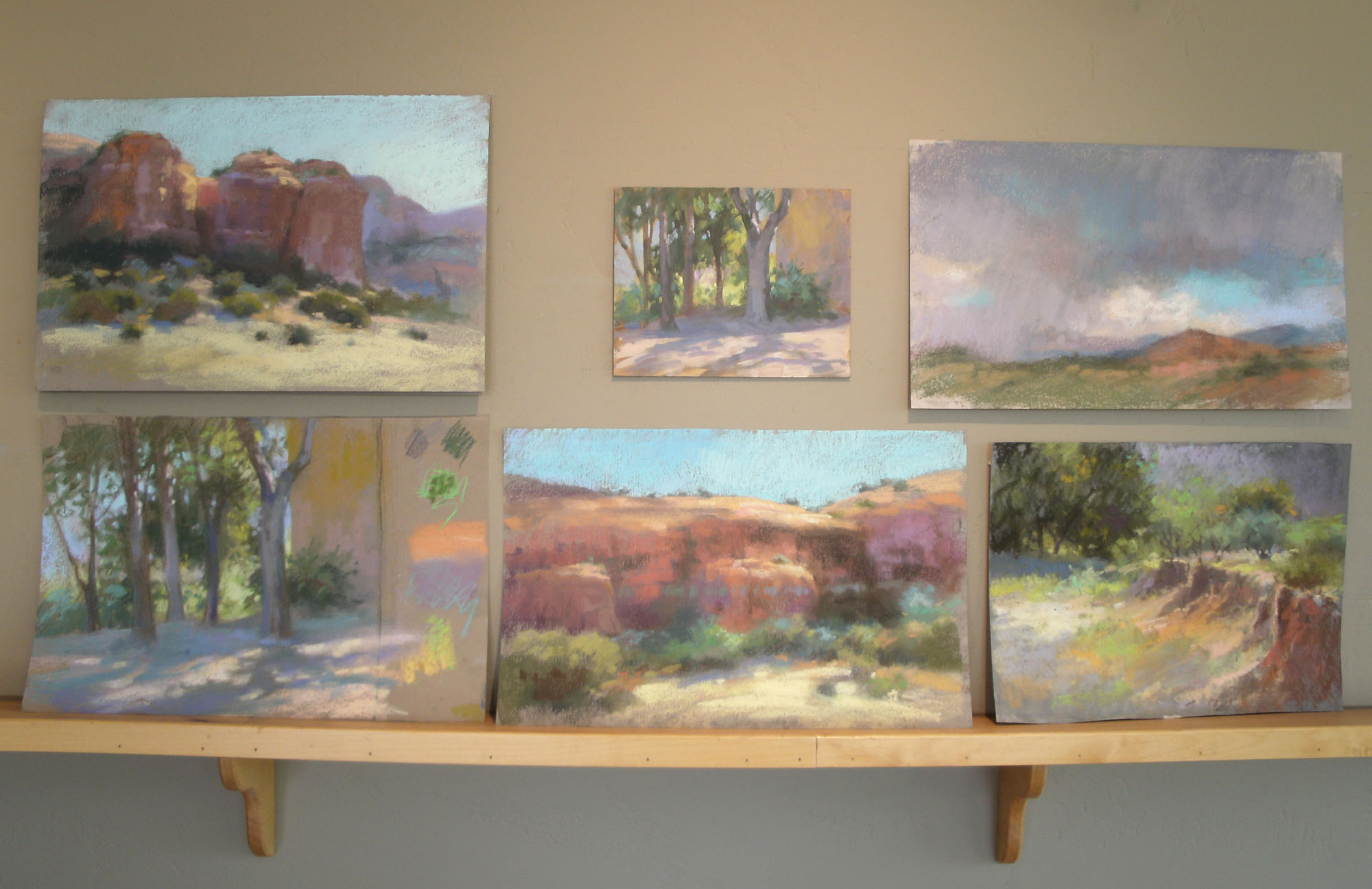 Back in the studio I have the luxury of having hundreds and hundreds of sticks to choose from, as well as a rainbow of papers and other supplies at hand. I’m fortunate in that I have the room to have two or more easels set up at the same time. And, it’s so nice to have the comfort of heat or coolness, especially when it’s 105 degrees Fahrenheit in my home of Arizona!