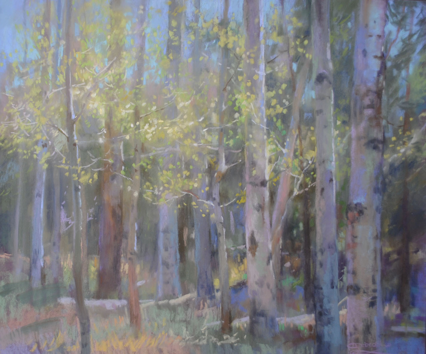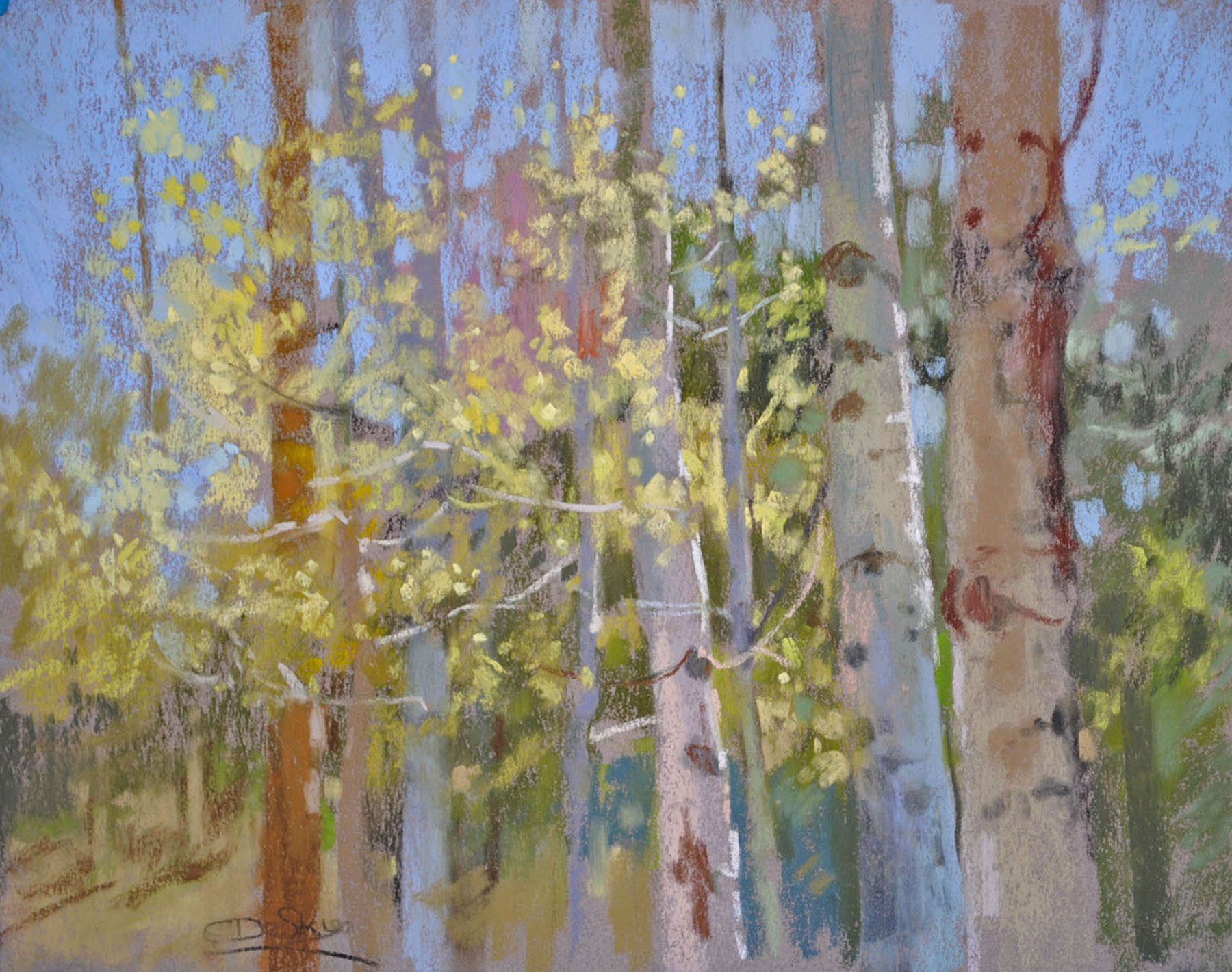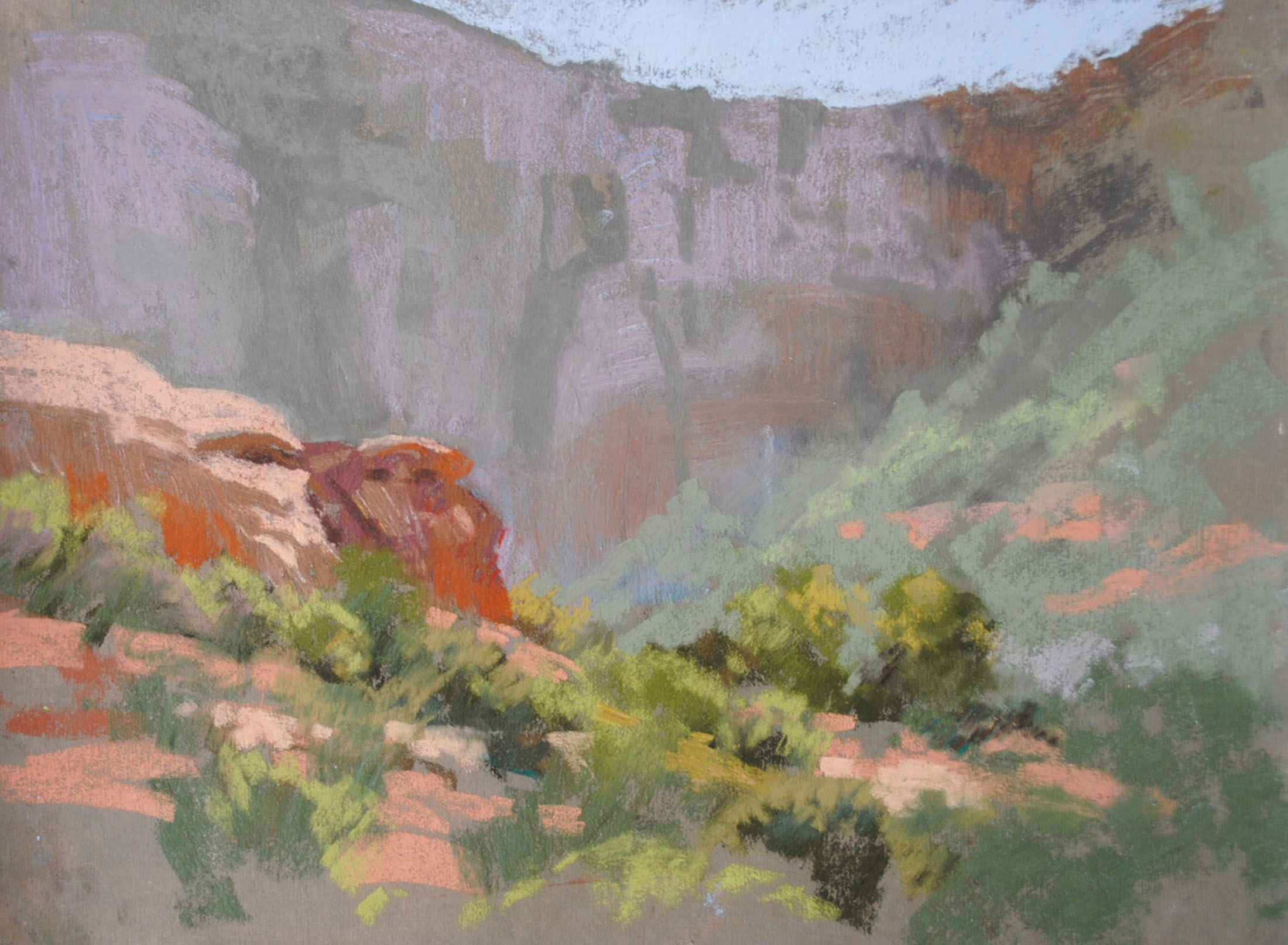 Back in the studio I have the luxury of having hundreds and hundreds of sticks to choose from, as well as a rainbow of papers and other supplies at hand. I’m fortunate in that I have the room to have two or more easels set up at the same time. And, it’s so nice to have the comfort of heat or coolness, especially when it’s 105 degrees Fahrenheit in my home of Arizona!