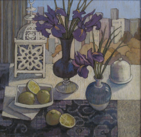 Here’s another still life arrangement that’s exactly the same size and format as the one above. But how different it looks and feels! Here the artist also uses a limited palette time but this time the colours are a muted arrangement of violets, warm browns, and creamy whites punctuated by a few greens and blues. The purples are intense but in their darkness, they appear subdued in amongst the more neutral and less intense colours around them.