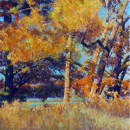 The field in front is kept simple and although filled with colour and texture, all sit within the same value and so don’t grab our attention away from the stars of the show beyond. They support and add context to the view. The horizontal strips of water behind add some calm to the confusion and tell us that we are by a river somewhere on a warm fall day. The sun shines and all is well in this part of the world.