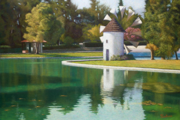 This mainly green picture underlines the introspective nature of the piece – cool green water, trees of warm sunlit green and dark shaded greens, warm swaths of lime green lawn. The greens are broken up by the pinks of a flowering tree in the distance (behind the windmill) and the orange of a tiled roof of the wee building on the other side. There’s also the blue of the pool-like area on the right. The white of the windmill and various paved edges and the pale cool blue of the sky also lighten the heavier overall green colour.