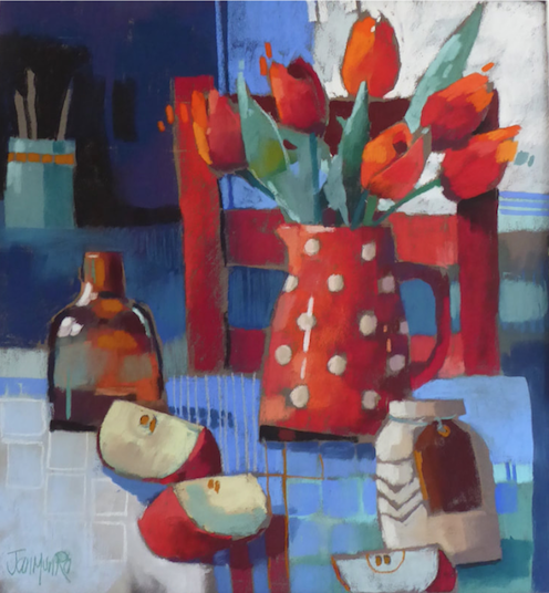 I feel happy when I look at this painting of everyday things arranged in an almost haphazard way as if not arranged at all. Yet there is a clear path the artist has prepared for us to take around the painting. Objects overlap which leads us from one item to the next. The chair is overlapped by the jug which also covers the stems of the tulips that sprout out of its mouth. The jug is overlapped by a jar which in turn is partially blocked by an apple slice. The edge of the paper cuts off the apple slice and we are bounced back toward the diagonal line of overlapping apple slices that ends at a dark bottle that sits against a dark background. From there we leap through the darkness, still on the diagonal course, to a turquoise canister from which spring thin long shapes. These forms echo the verticality of the chair and also the frame of a window. All of which visually brings us back to the tulips. Overlapping shapes, repeated forms, and visual contrasts in value and colour help move our eyes around the painting. On the second run through, there’s time to explore and enjoy the details of colour, line, and shape.