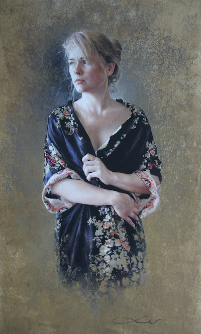 And her technique is to be admired! Look at the sensitive way Nathalie Picoulet renders the smoothness of skin, the texture of satiny fabric, the perspective of the hand, the solidity of facial features. The figure emerges from the background, fully formed except, as our eyes move to the lower areas, at the edge between background and fabric. The edge dissolves and the colour of the background becomes the colour of the floral design. This is a gentle reminder that for all the meticulous depiction of the figure (and for sure she is actually there!), this is still only an illusion of three-dimensionality on a two-dimensional surface.