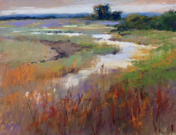 I love the dreamy colour of this poetic landscape by Willo Balfrey. It also shows that perfect time of day when all is revealed in the crystal clear air of the morning. The scene is a simple one: a water zigzags its way through the landscape, disappearing in the distance, land on both sides and sky above the horizon. A few bushes and a small stand of trees, as well as the grasses in front, offer some vertical notes to the piece. This minimal scene is an excuse to revel in pastel strokes and glorious colours!