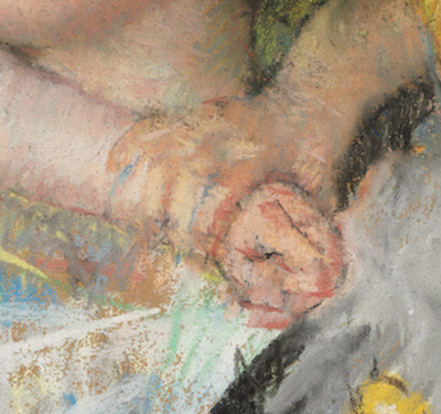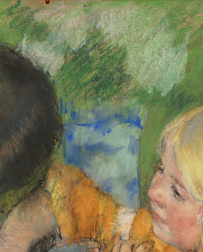 I’m always keen to see the hand of the artist at work and overjoyed when I discover some of the underdrawing still visible in a piece. You can easily see signs of Cassatt’s charcoal drawing in this detail. See how she drew the mother’s arm beneath the clothing? And you can also see the original outline of the girl’s clothing.