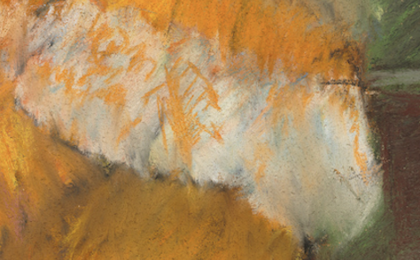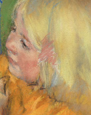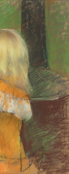 The young boy gazes at his sister. His hair, tousled and beautifully rendered with a few swipes and strokes of pastel, echoes the yellow and orange colours in his sister’s outfit, yet again tying them together visually.