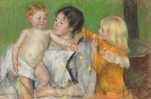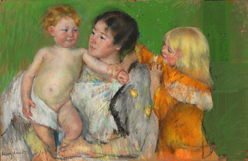 I love seeing the differences between the two paintings. Here, the towel is laid out on the mother’s lap. The colours are much more muted. And, all the attention by both females is towards the boy. The feeling is certainly different from the previous piece where it’s so much about the relationship and link between the children.