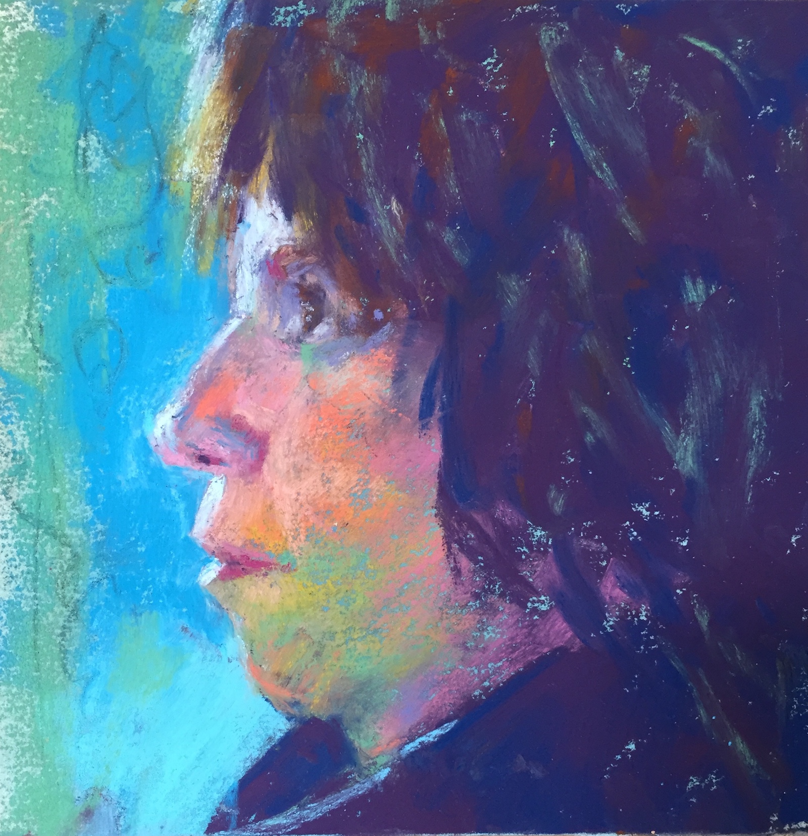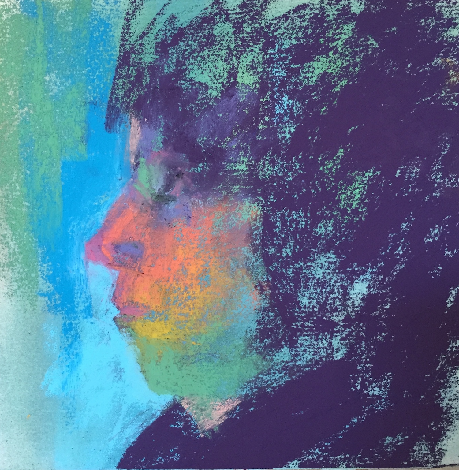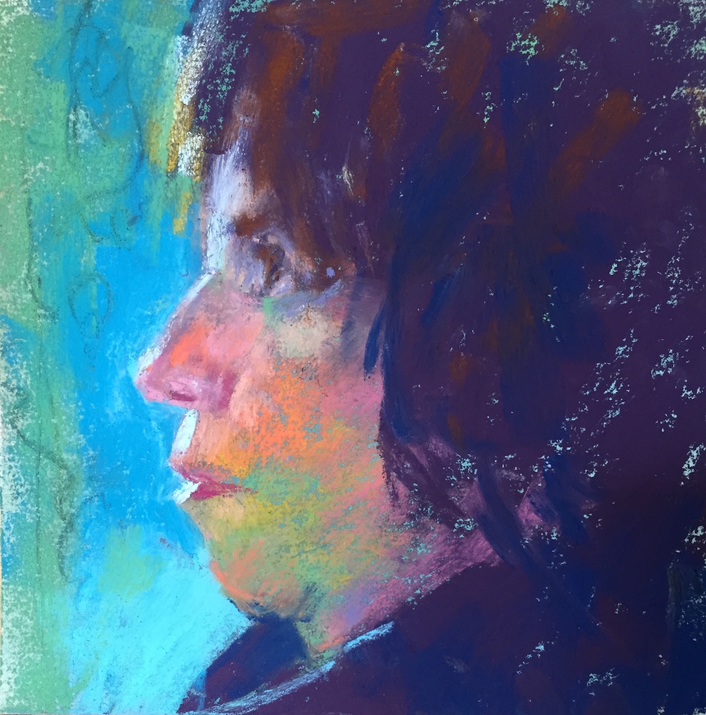 I love working from life best but a profile? Right now, it would take too much effort to set up mirrors. Time for a selfie…where I can’t see what I’m taking! I snapped a few, mostly missing the subject (me!) altogether, but here’s the one I worked from. Not very clear but good enough to grab some info from and get a quick pastel going.