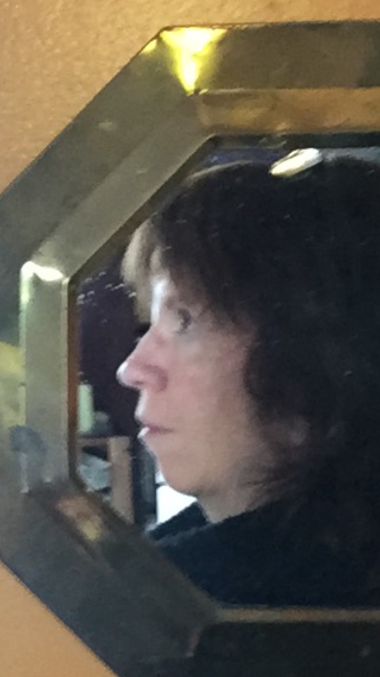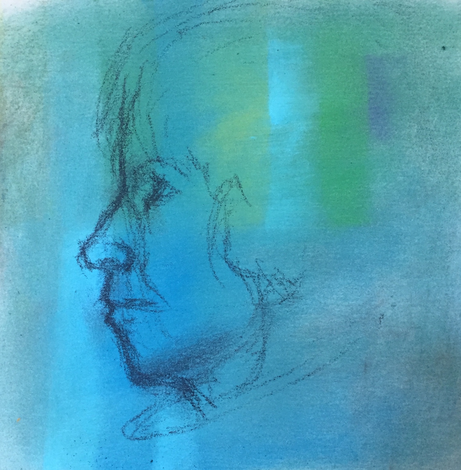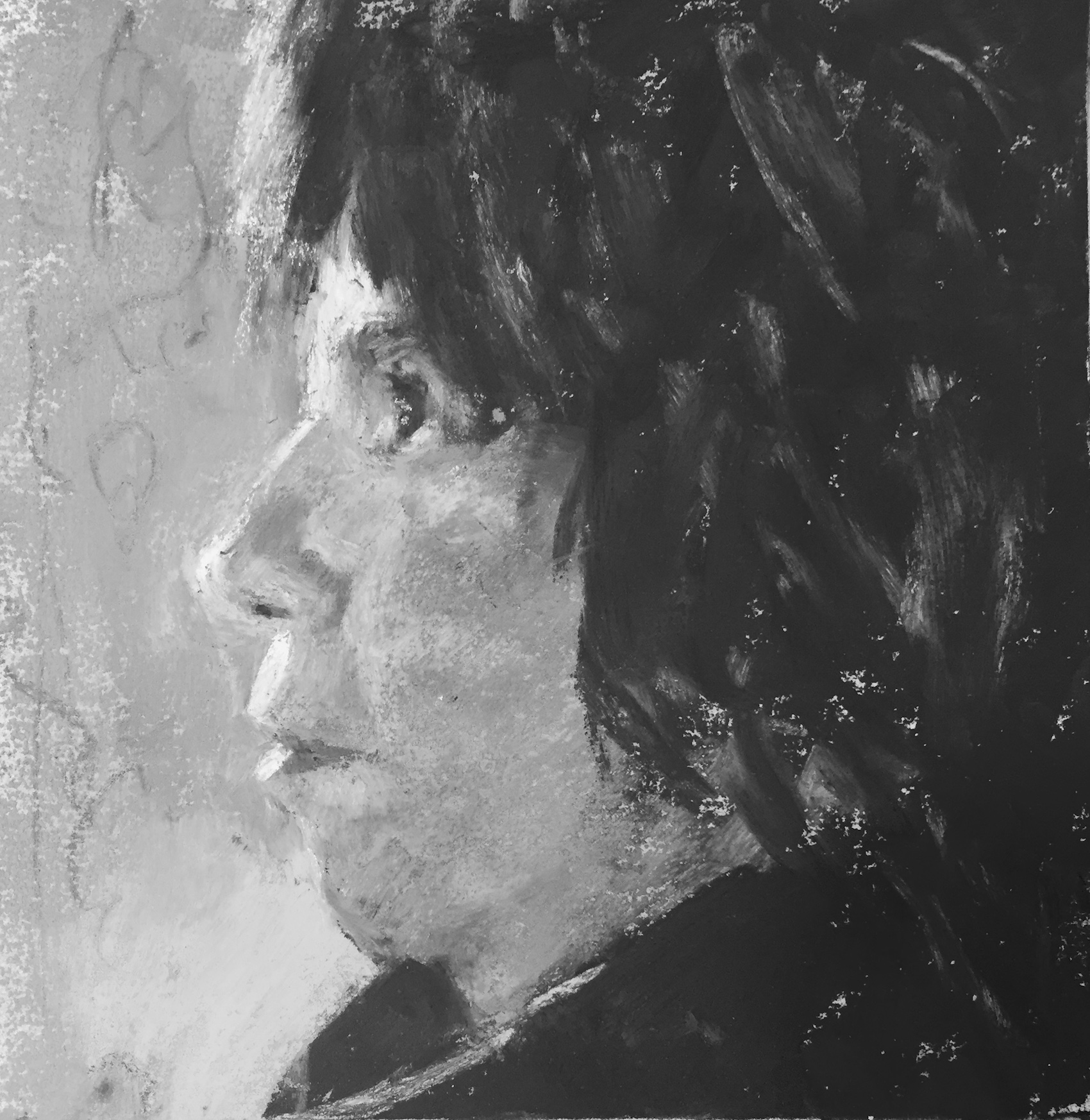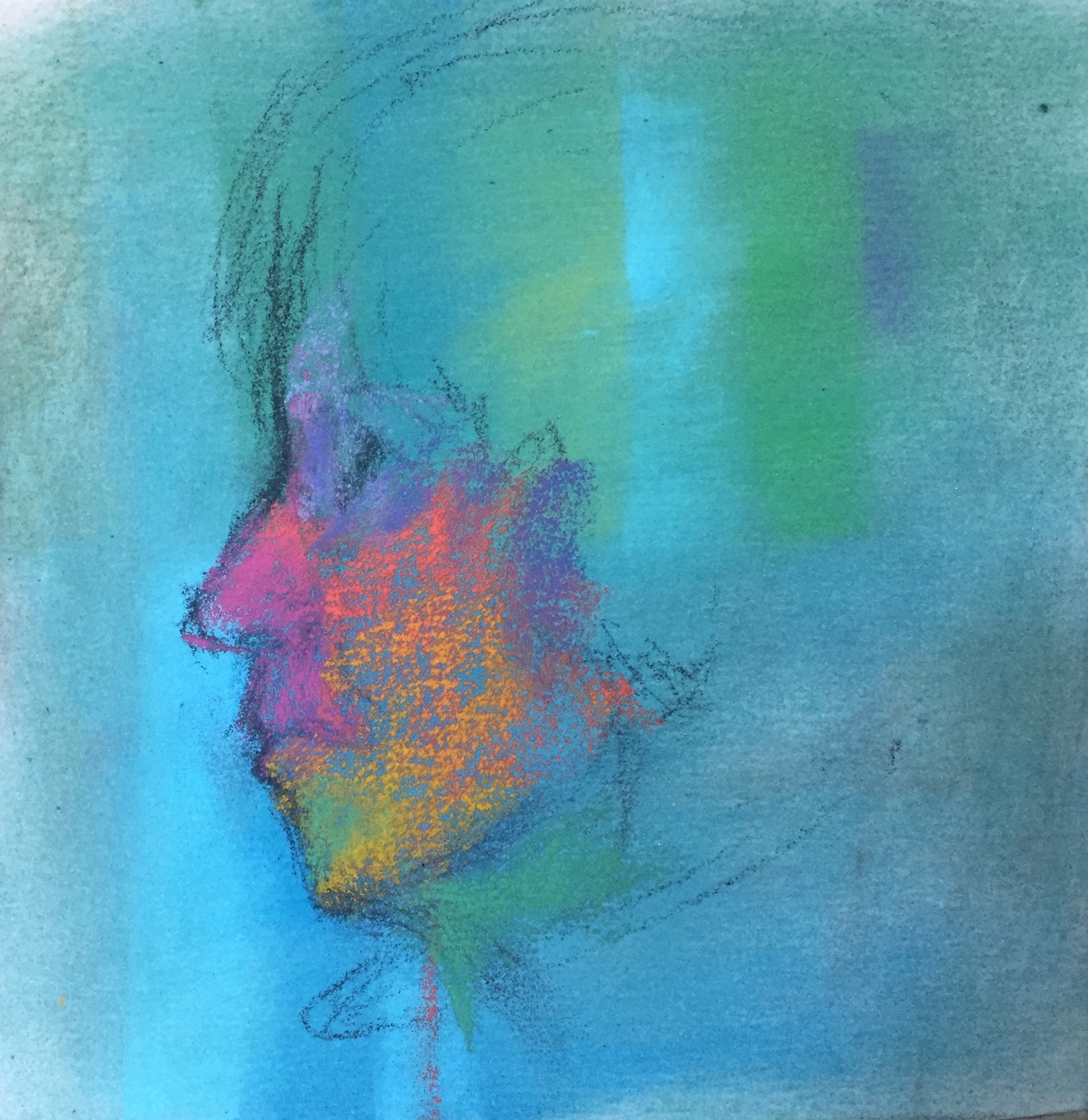 I love working from life best but a profile? Right now, it would take too much effort to set up mirrors. Time for a selfie…where I can’t see what I’m taking! I snapped a few, mostly missing the subject (me!) altogether, but here’s the one I worked from. Not very clear but good enough to grab some info from and get a quick pastel going.