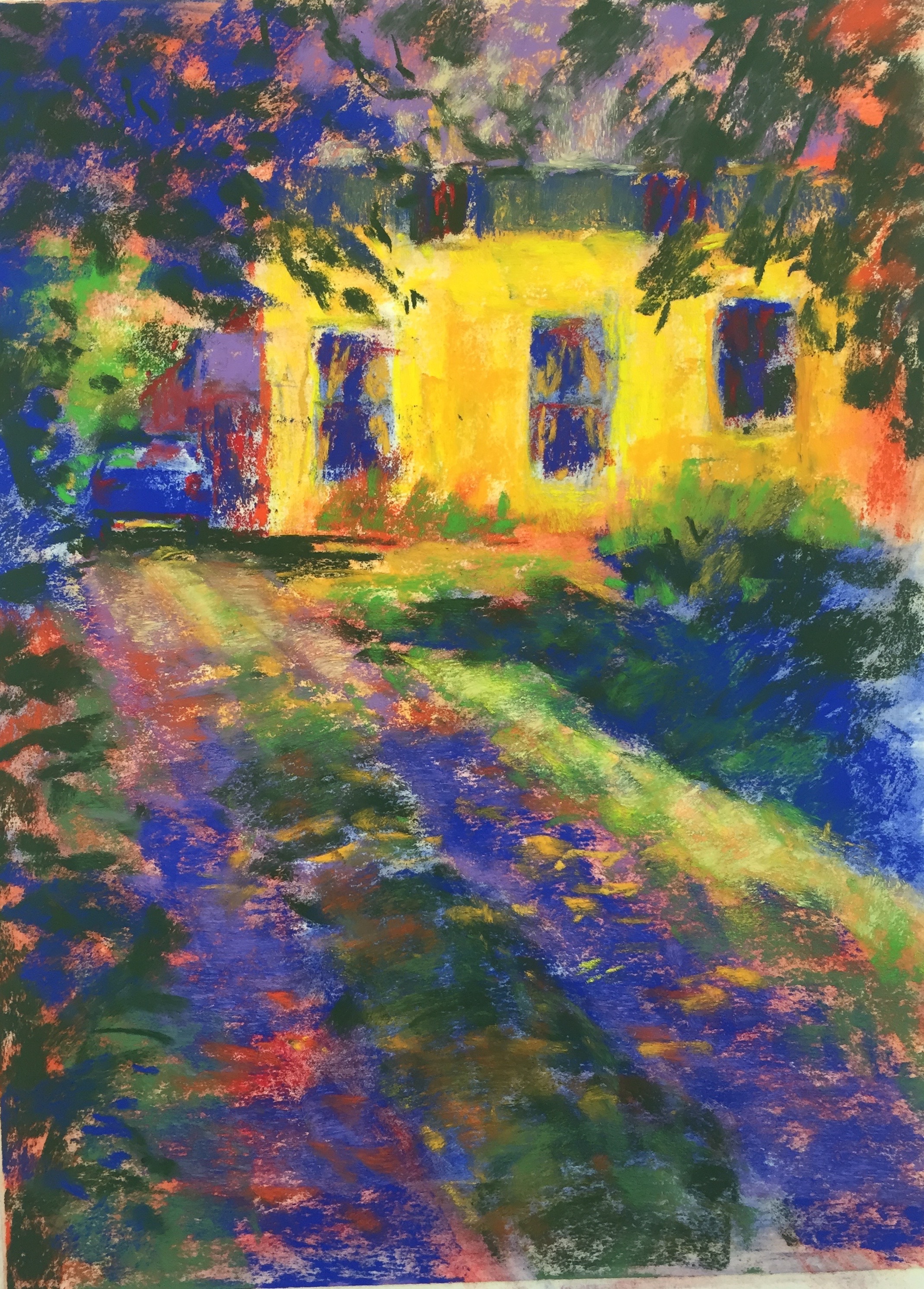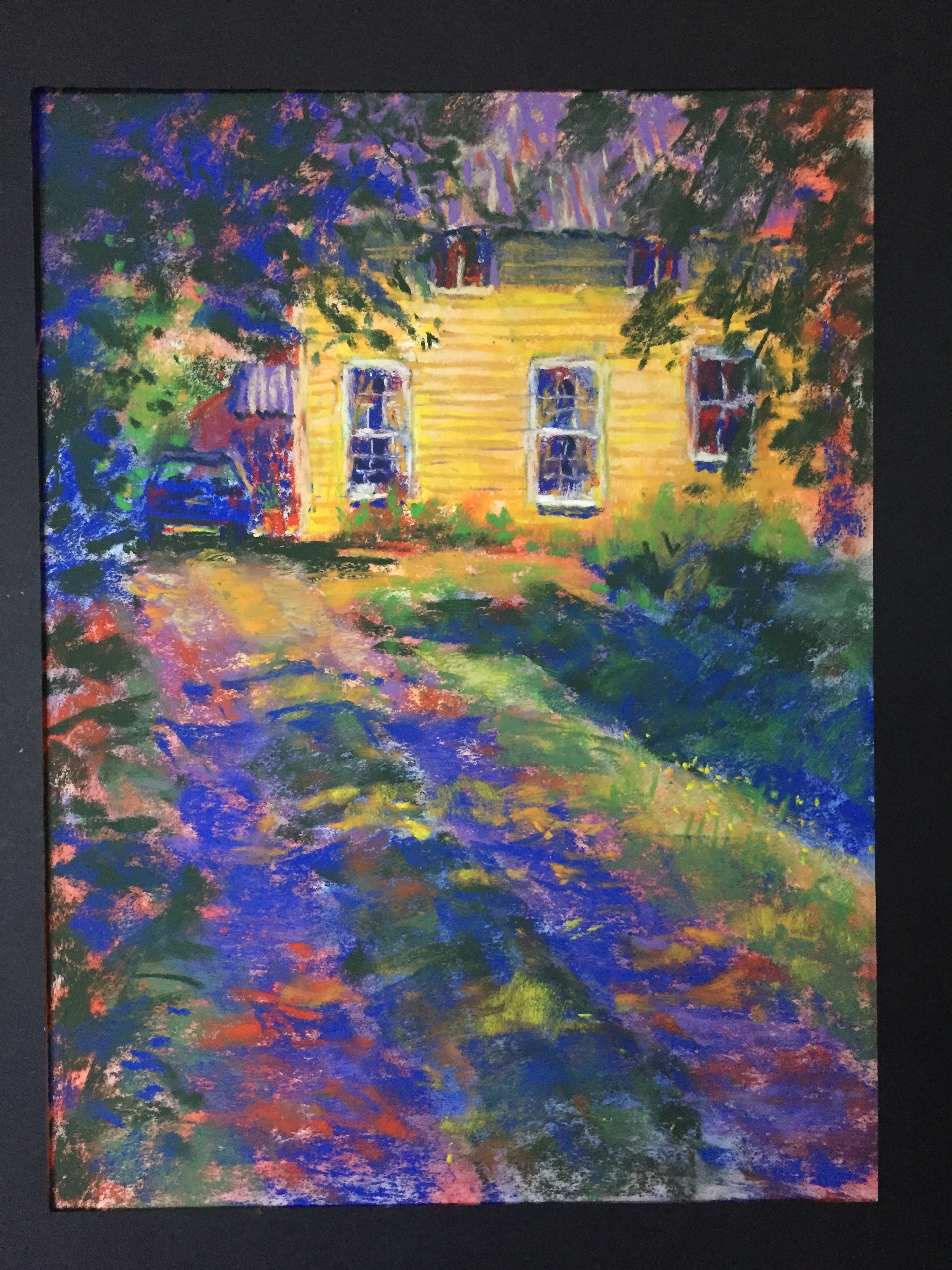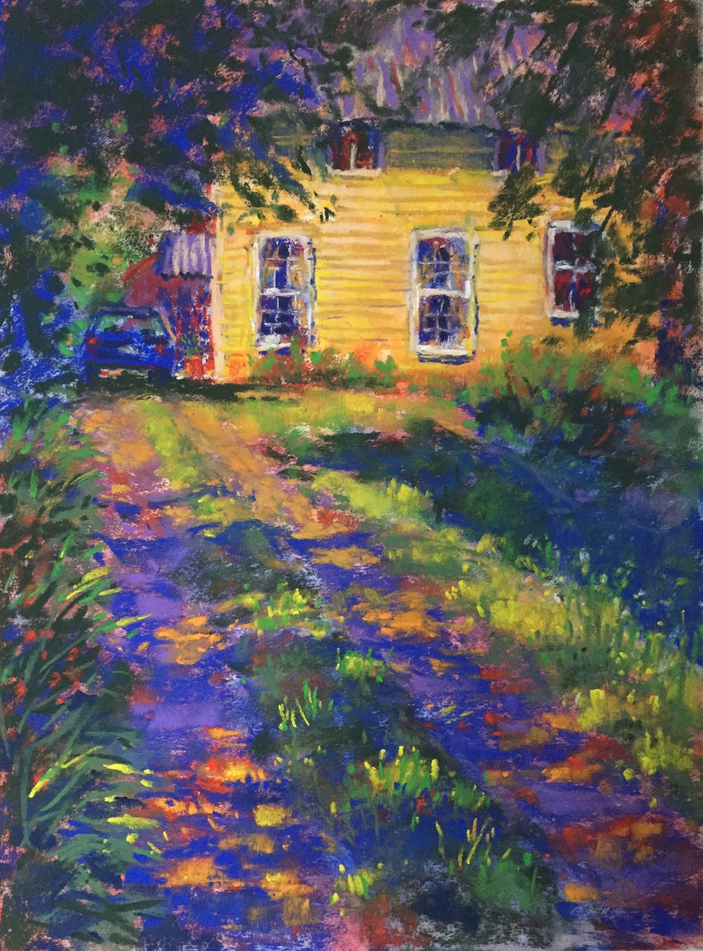 Before I go on, let me tell you what attracted me to this scene. I have passed this place by car so many times and thought, I’d like to paint that! Why? Well first off, I’m a sucker for paths and roads that take us somewhere (obvious or hidden). I also love the light patterns made by trees over such paths. And I love yellow houses! This scene had all these elements in spades.