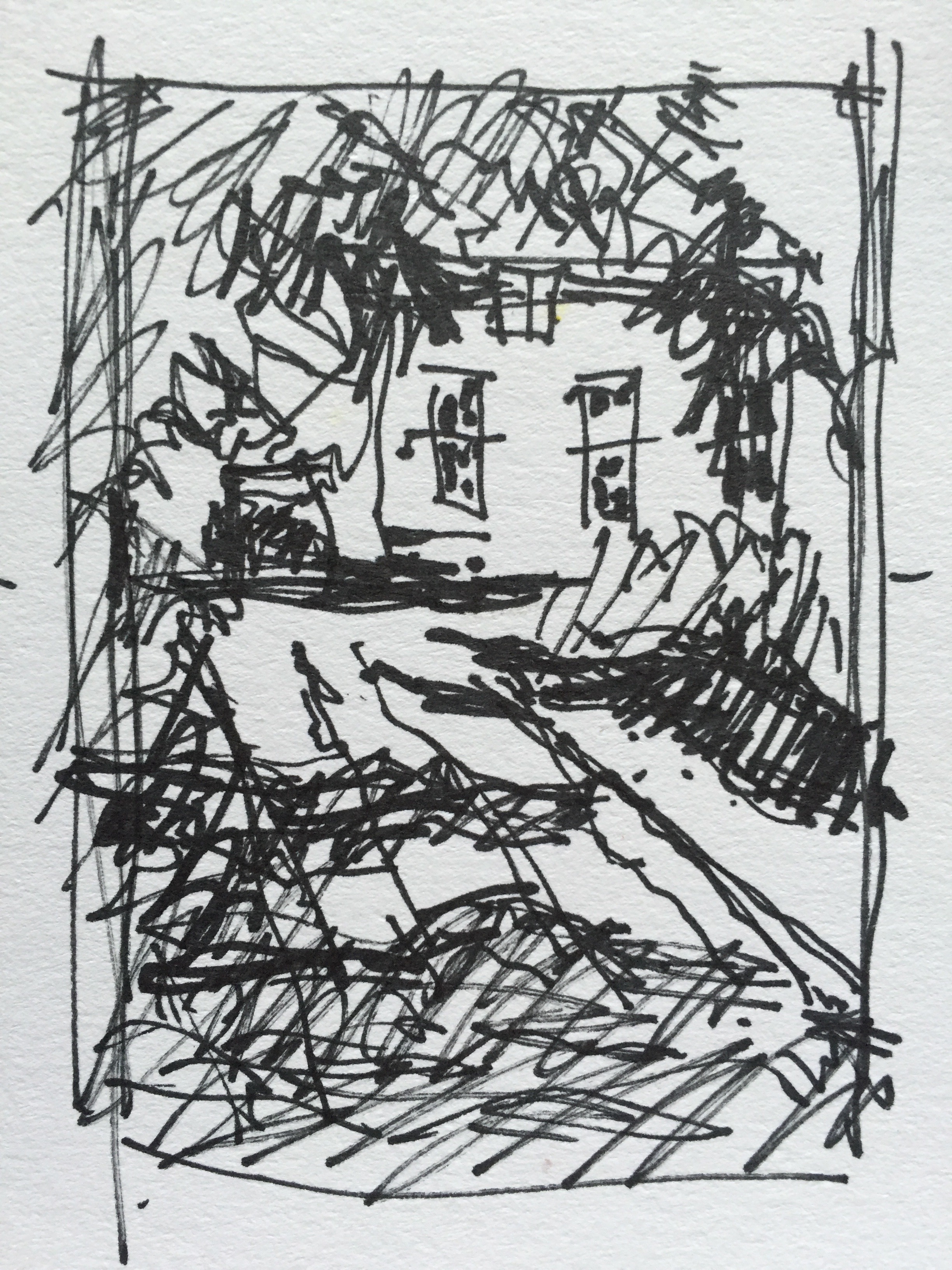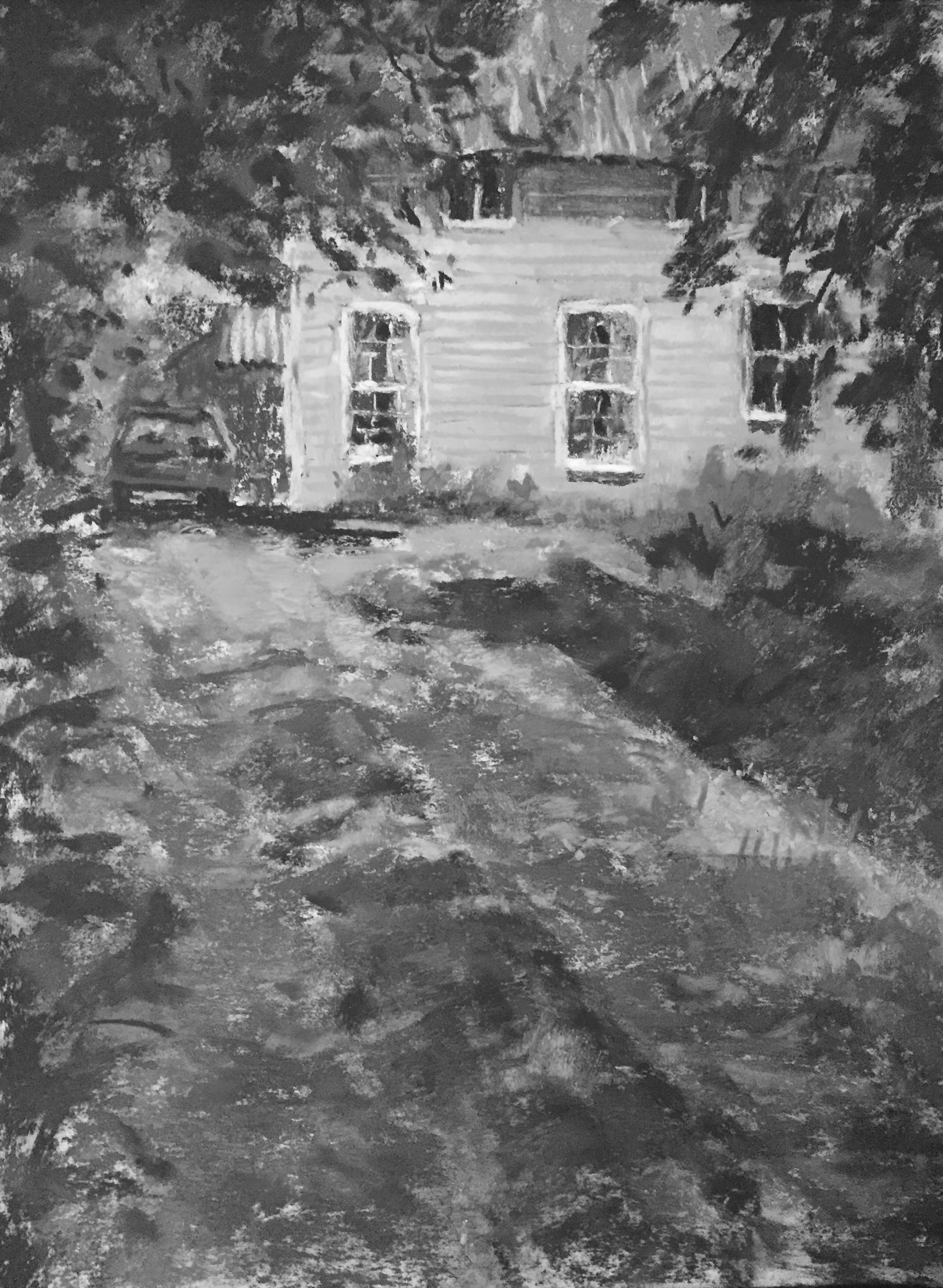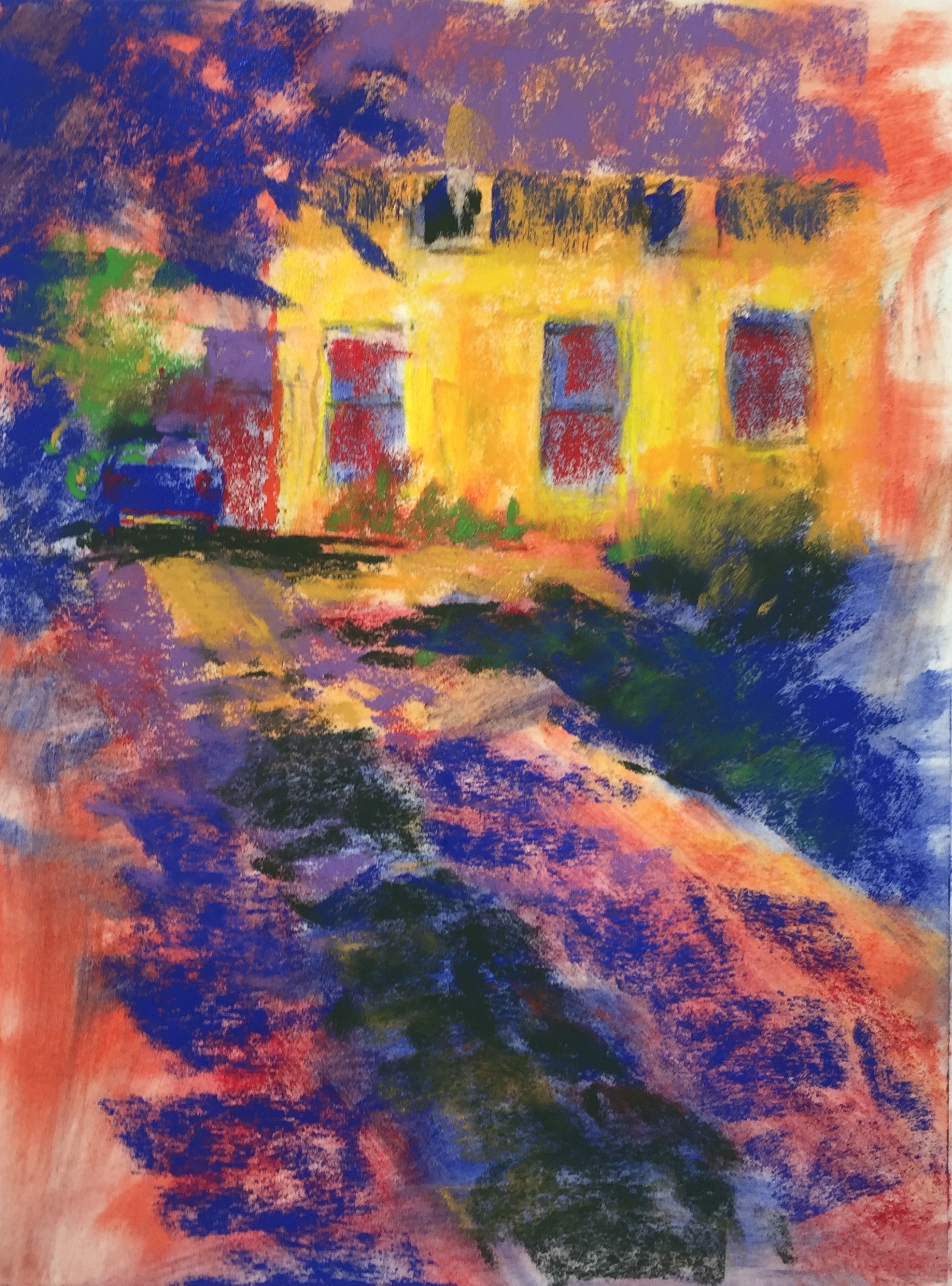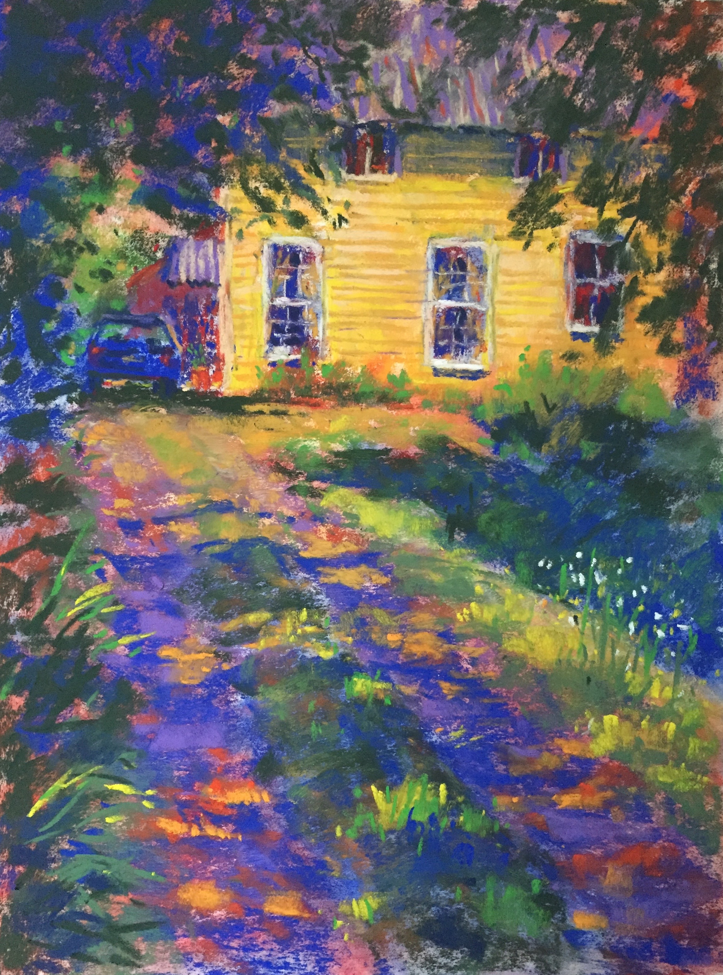 Before I go on, let me tell you what attracted me to this scene. I have passed this place by car so many times and thought, I’d like to paint that! Why? Well first off, I’m a sucker for paths and roads that take us somewhere (obvious or hidden). I also love the light patterns made by trees over such paths. And I love yellow houses! This scene had all these elements in spades.