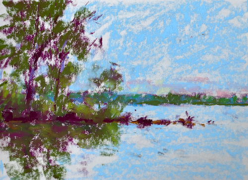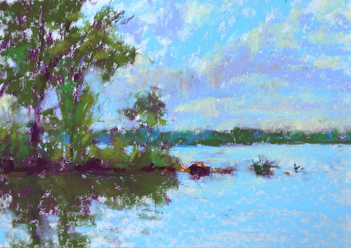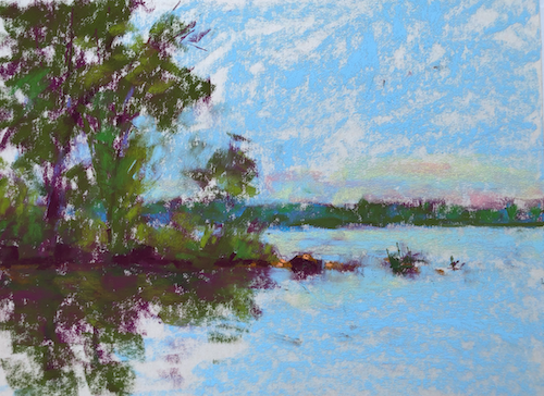 Gail, I love the way you can produce such a colourful and interesting painting with these few pastels and no easel. I bought a plein air easel a couple of years ago, but i have found it a lot of bother to set up. I haven’t done a lot of plein air, usually with the same friend, and found pastel a bit messy-prefer water or gouache sketches. But the best thing is the interactions I’ve had while painting. Last time a bunch of school kids on a camp who had been kayaking came and had a look and admired my painting (although I thought it was awful). I spent the next few minutes telling them about pastels and how doing art is fun and can enhance their lives. That was the day I left my pastels on top of my friend’s car and lost them – I’ve already told that story! Another time a pelican came out of the water and right up to me- slightly unnerving but memorable!