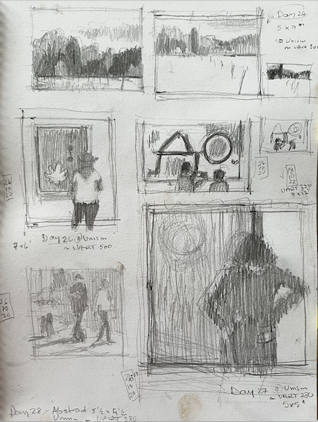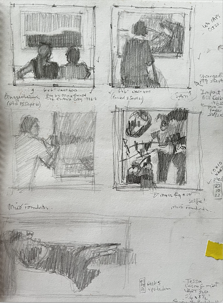 I love seeing your thumbnails, your dog walking and gallery goer series. They are inspiring! I especially love the Miro painting. The man’s face turned for the selfie echoing the figure in the upper right of Miro’s painting is wonderful.