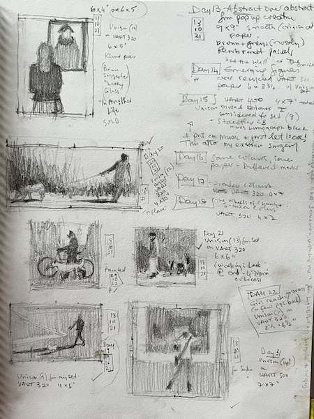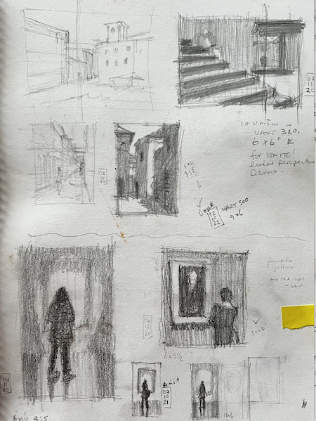Here’s another example. This is an assorted example of thumbnails – architecture and gallery goers. I chose the Tuscan town scene to paint. It was a nice change from the figurative work midway through the Challenge.