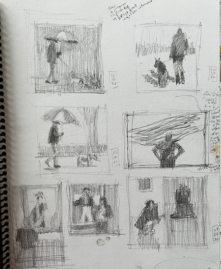 I like working on a series. I’ve been doing Dog Walkers and Gallery Goers for a couple of years now and they are still going strong. Working on a single theme (eg Gallery Goers) helps me know what to get to work on when I have time to do thumbnails. And since I enjoy painting these subjects, the more thumbnails I have in inventory, the better!