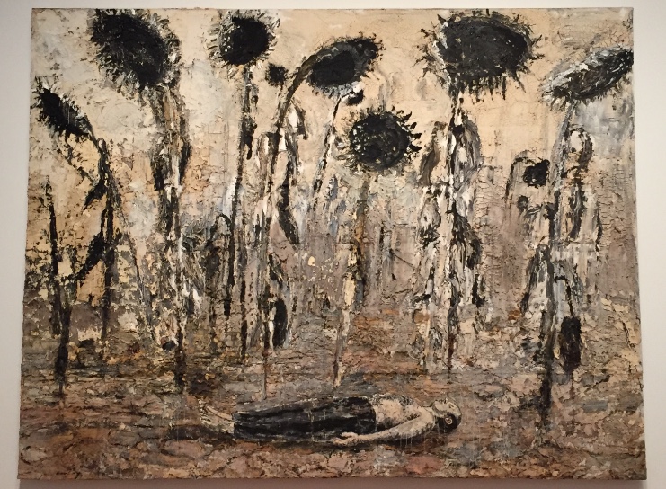 And then what? Without warning, a memory of a painting by Anselm Kieffer at the Seattle Art Museum came to me. It’s a huge canvas of sunflowers towering over a prostrate man (see below for the painting). And I realized, yes, I wanted to add a horizontal figure, one that represented Ray in death.