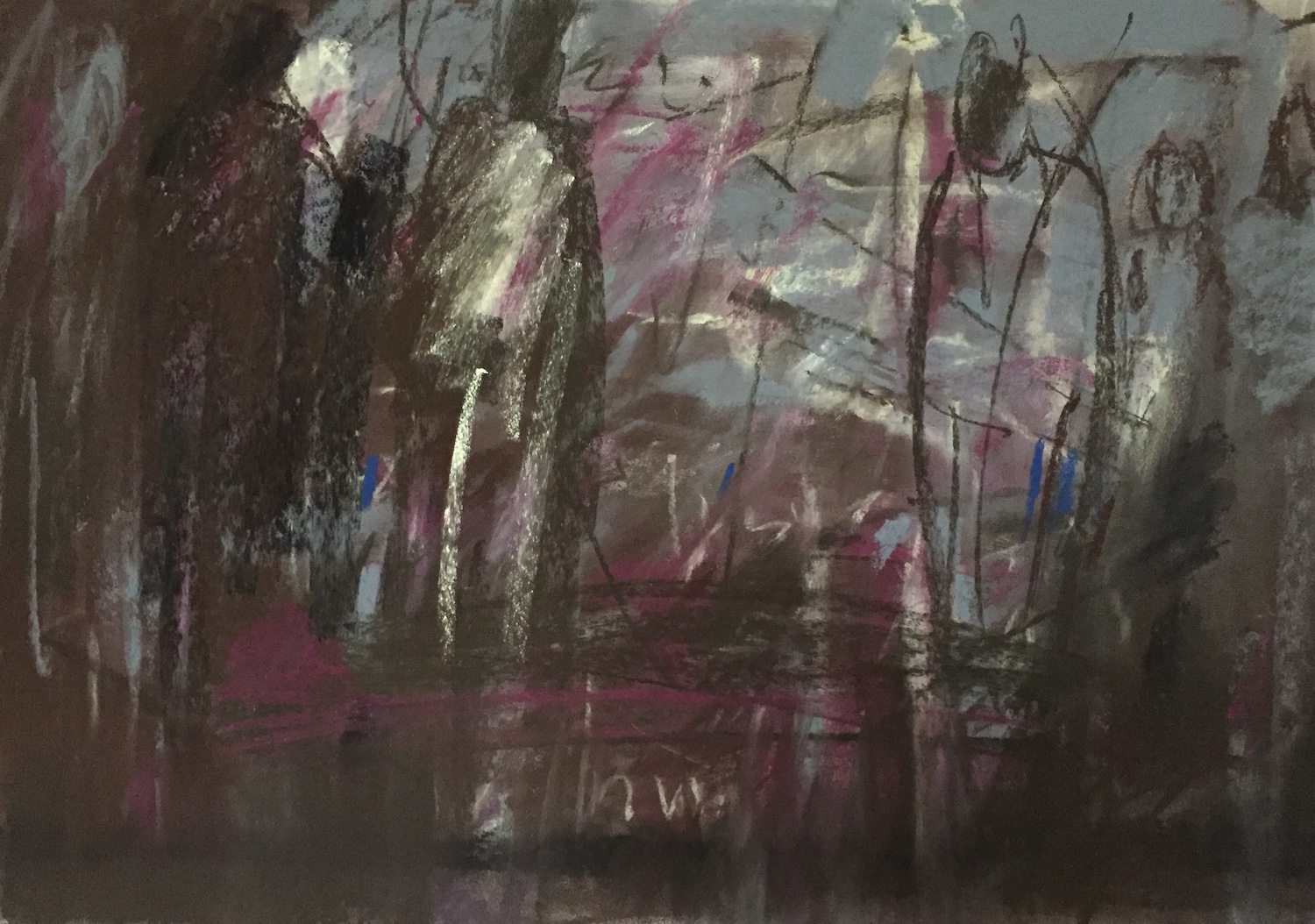 But at the same time, I pondered meaning. How was I to make meaning from this essentially non-objective piece? And then out of nowhere came an image of grieving figures. So I surrendered and began adding them, changing the work towards a more representational image.