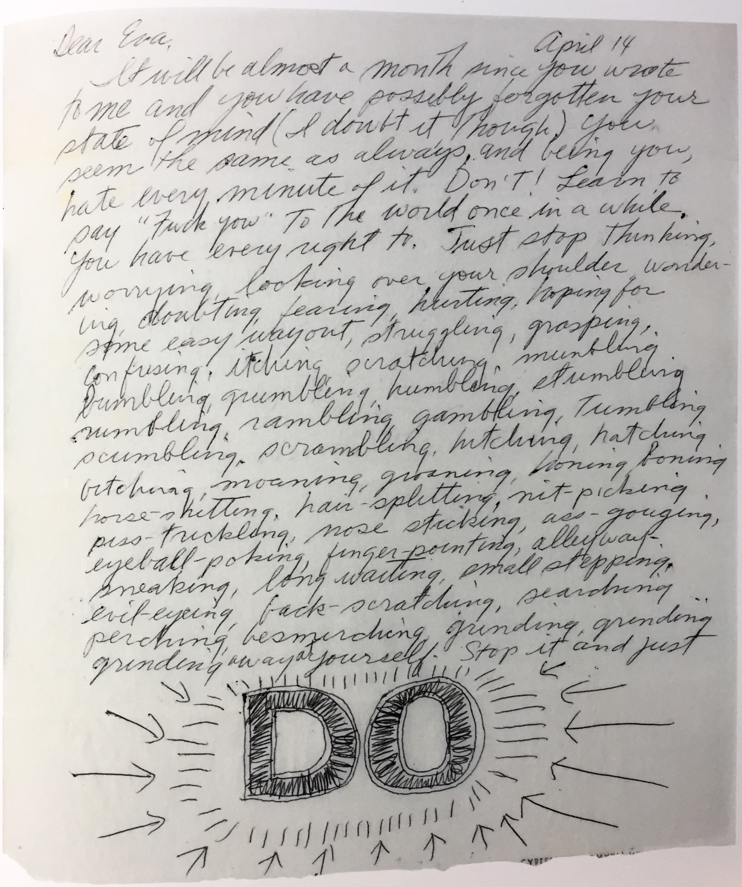 His letter is in response to one from Eva Hesse in which she must have moaned about the state of her work. If you’ve ever suffered self-doubt in your work, or if you do in the future, get out this letter and read/listen to it. You’ll find wise words to help motivate you.