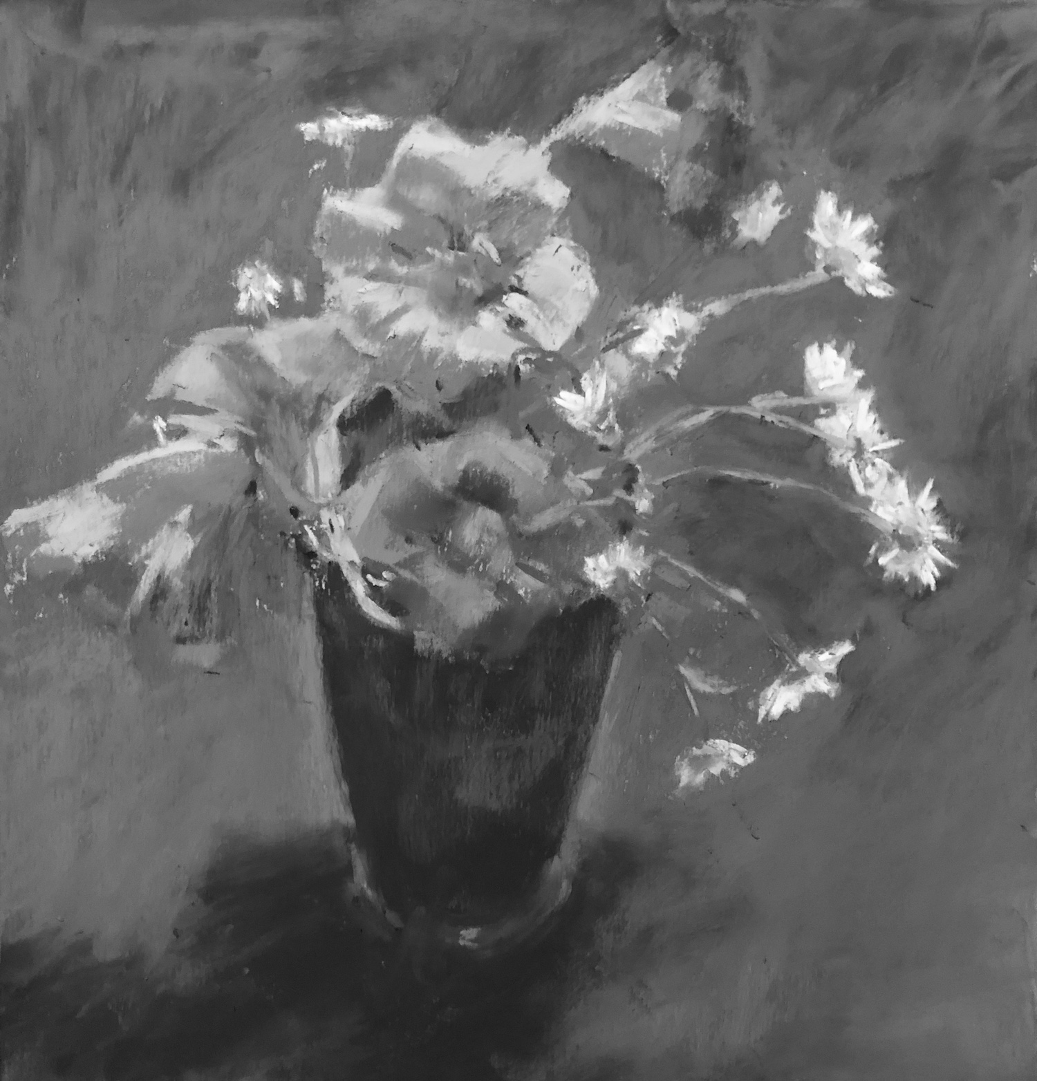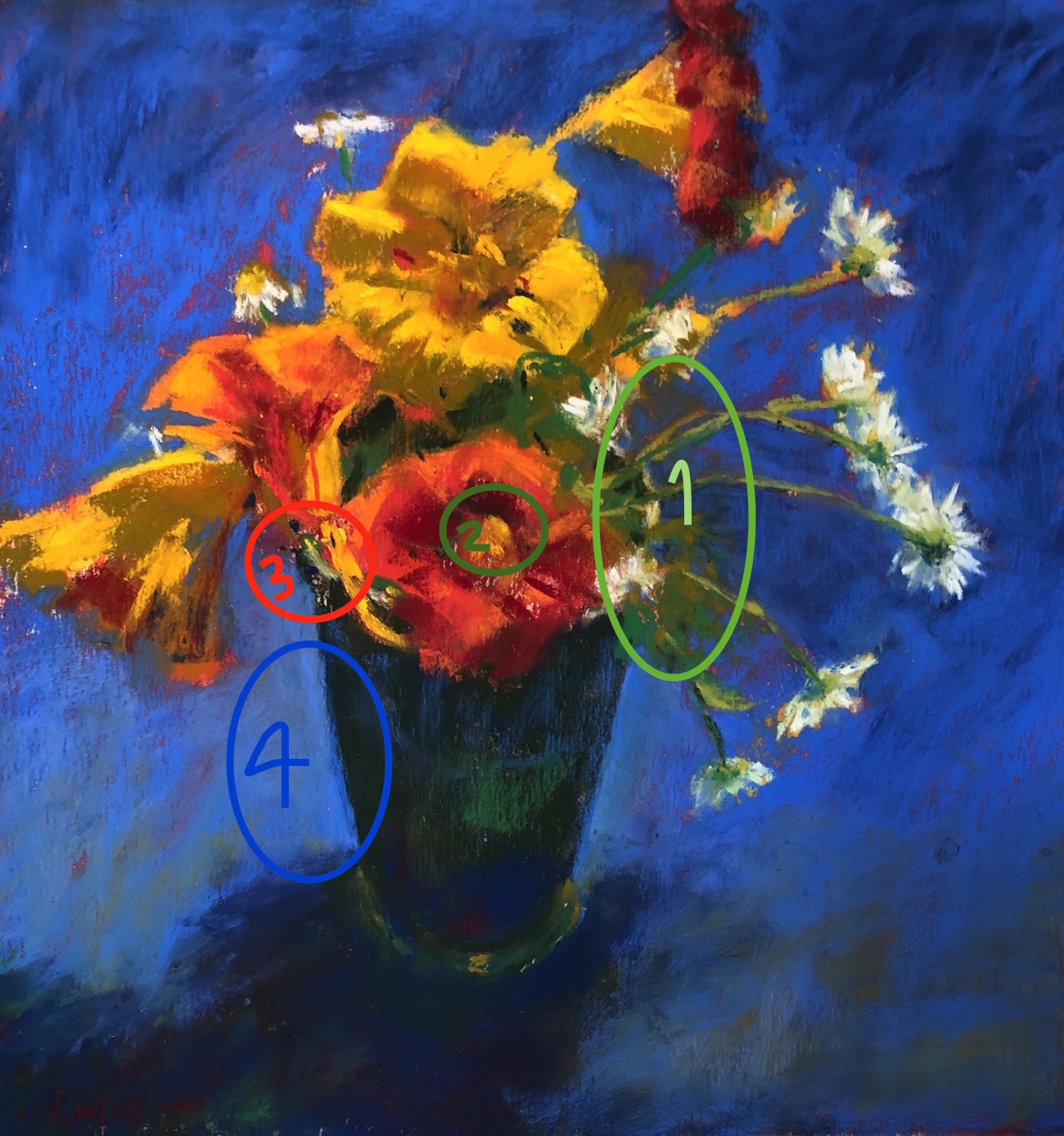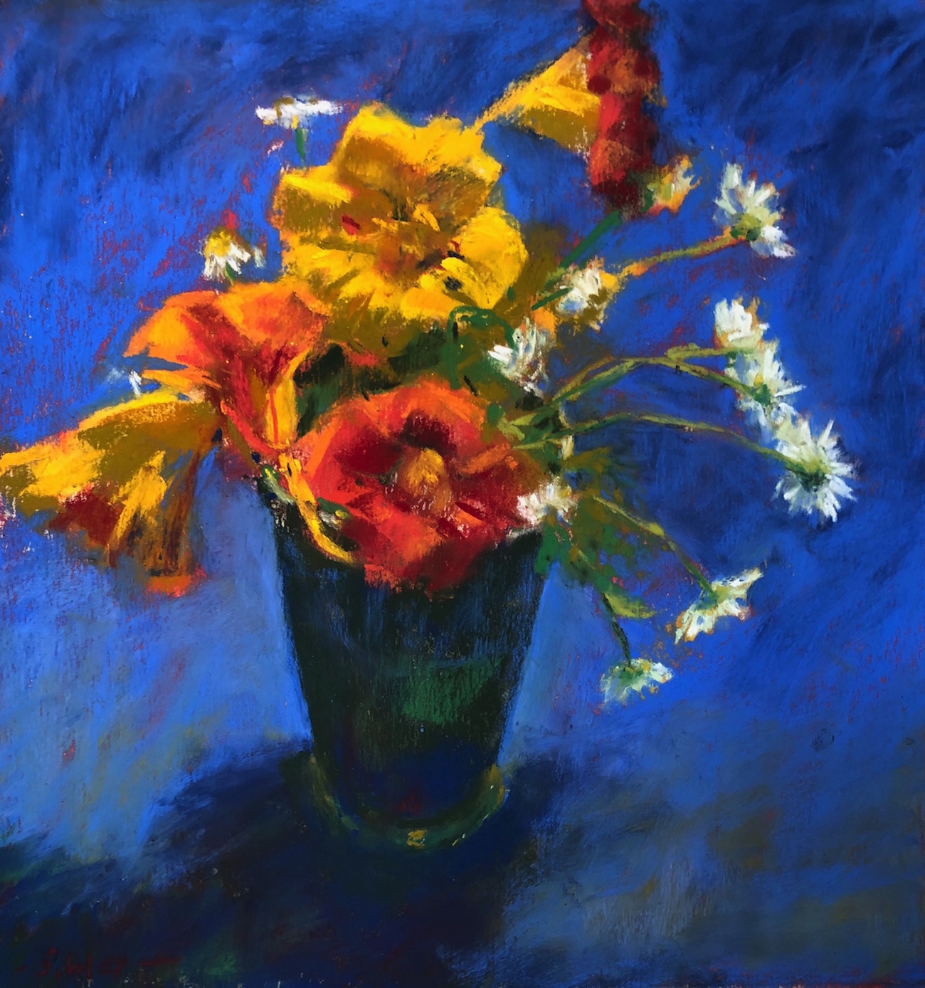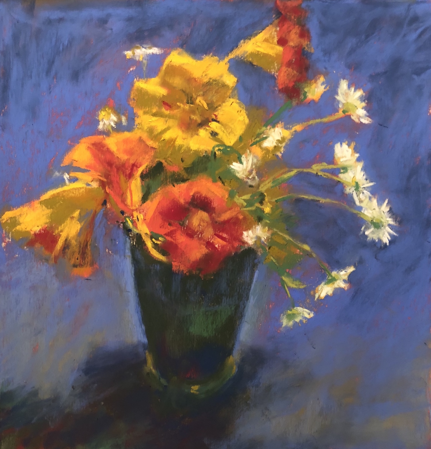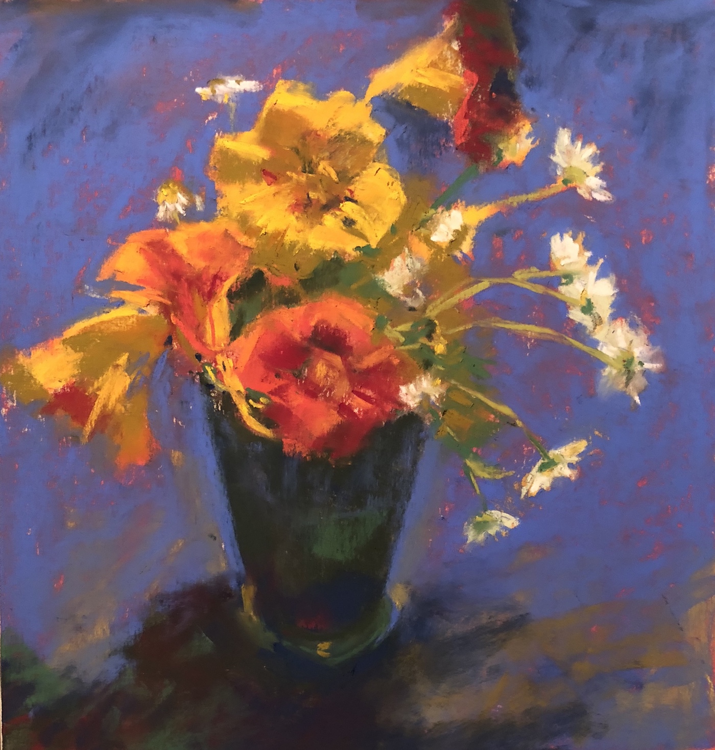 Here is the painting as it stands. I see a few things I want to tweak. For instance, I see where I forgot to cut the background in closer to the vase lip near the daisies. I also want to soften and further change the value of the background on either side of the vase. And of course, I still have to sign the pastel.