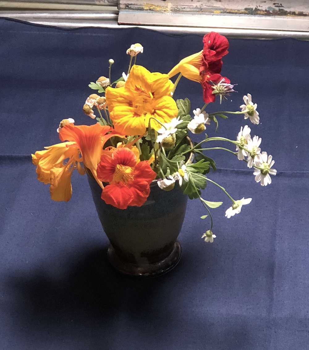Some final adjustments. I decided that the nasturtium at the top was just too dark, pulling the eye not only up but off the page, so I lightened it. I worked on the cast shadow, adding a transition area between light and dark. I made adjustments to areas of the background – lightning, warming, darkening.