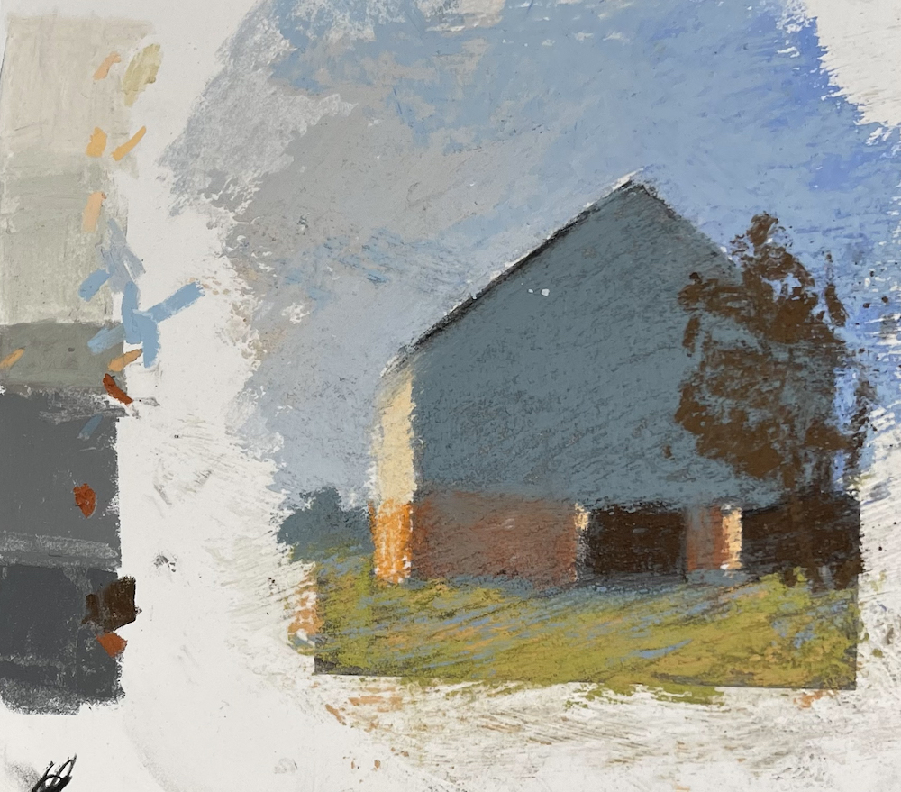 Colour Note Study for Barn 1, Complement blue/orange: Staying with the values picked out in the value study, colour is added in the blue and orange colour harmony of complement.