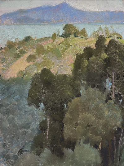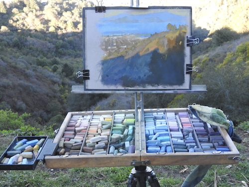 I currently primarily use Terry Ludwig and Blue Earth, both are unwrapped, rectangular sticks with the Blue Earth about 2/3 the size of a Ludwig stick. Terry Ludwig Pastels use a lot of atmospheric color blends that make it easier in landscape to push elements back in space without excessive mark making. Blue Earths have a useful mix of lights and darks to grays within a box of any hue. In the past I’ve used Unison, Schminke, the glassine wrapped Sennelier, Mt. Vision, and Great American. I am not fond of the unwrapped, half-stick Senneliers, because they are usually slightly curved, so out of the box, you can’t use them on their sides very well.