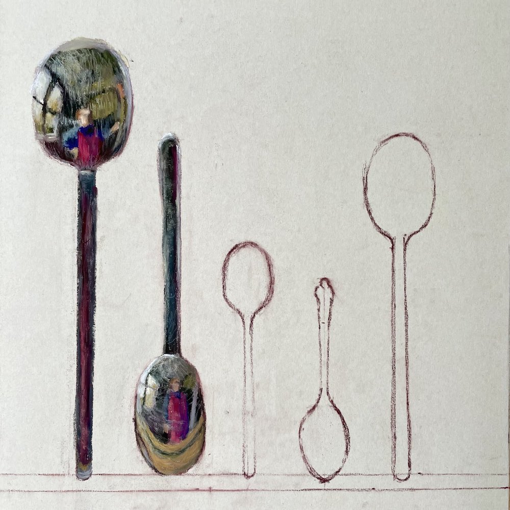 My daughter had been busy drawing typewriters at the kitchen table for her A-Level Art homework. It reminded me of my own experience of drawing household objects. I noticed my reflection in a ladle as I cooked tea and that was it. It made me smile and thought it would be an interesting exercise. I drew it from life, quickly. Moving on, I added a large serving fork and vegetable serving spoon, (which was a bit of a challenge because it had lots of holes in it). This was Ladle Selfie II.