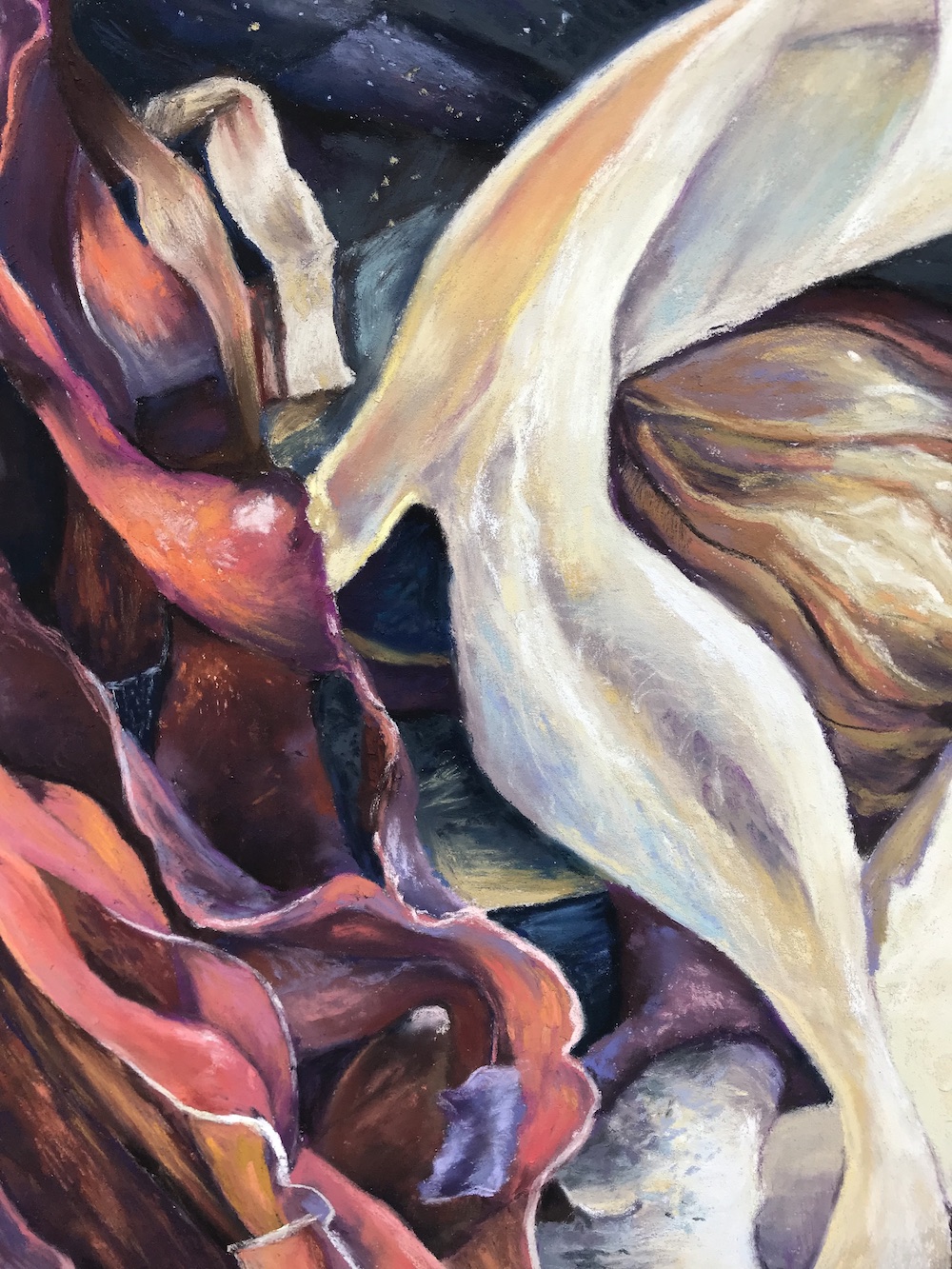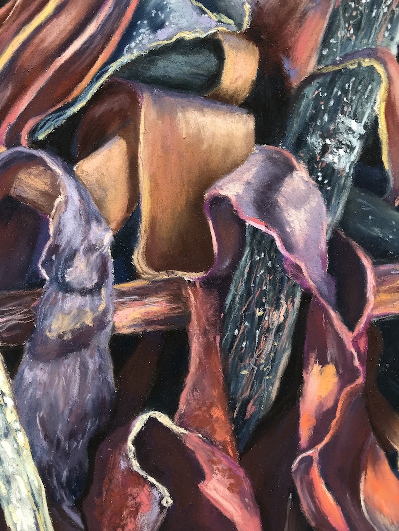 The shadows I created became an integral part of the composition, carefully considered and rendered with delicate layers of pastel to build up subtle tones and nuances of shade. The process of creating Finding Honesty was very different from Fire of The Deep in which I used a great deal of careful blending to produce a sheen to the seaweed.