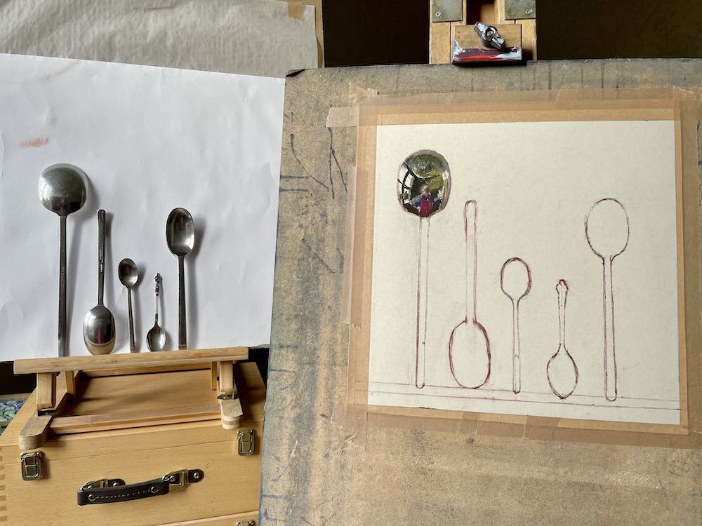 resonates with life and colour (including greys); all slightly different. Her use of light and marks is brilliant. I particularly like the spoons, but they are all beautiful. Thanks Fiona and Gail.