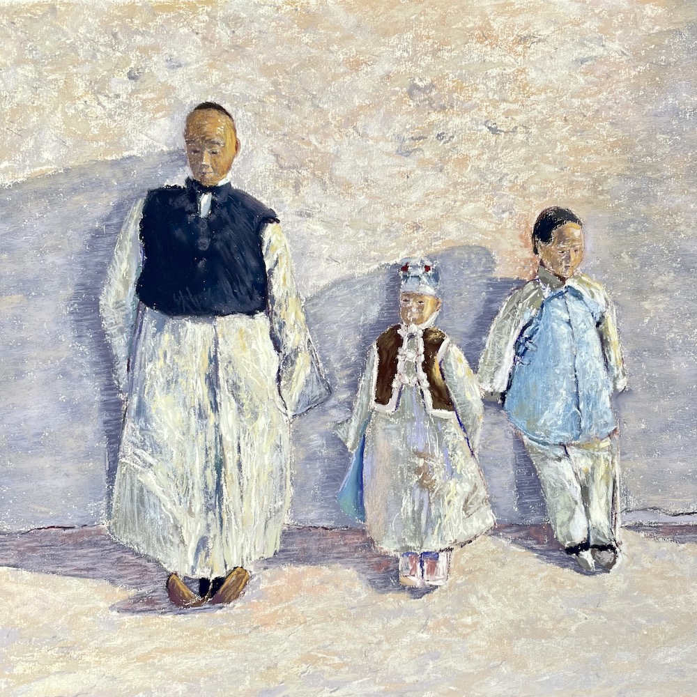 I deliberately left the mark-making loose and light, reflecting fragility and age. The smallest doll, which I took to be a child, had some damage to the face, with the nose and mouth somewhat disfigured. The larger two dolls had quite fine features, carefully carved from wood. The clothing was faded, but there was indications of it all once being quite splendid. The colour inside the coat of the child was a strong blue, unfaded by light and tiny. Chinese knots featured on all the garments, holding them together. Each doll had undergarments, carefully fashioned from linen and cotton.