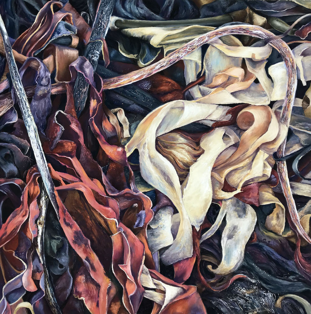 I started painting seaweed a few years ago after taking photos and sketching along the rocky beaches of Northumberland and Scotland. Winter storms had washed up masses of it – strewn along the shore in ribbons and twists of deepening colour. I am interested in presenting subjects that may be overlooked or unrecognised and I think this is probably why I got so engrossed in examining the seaweed that day.