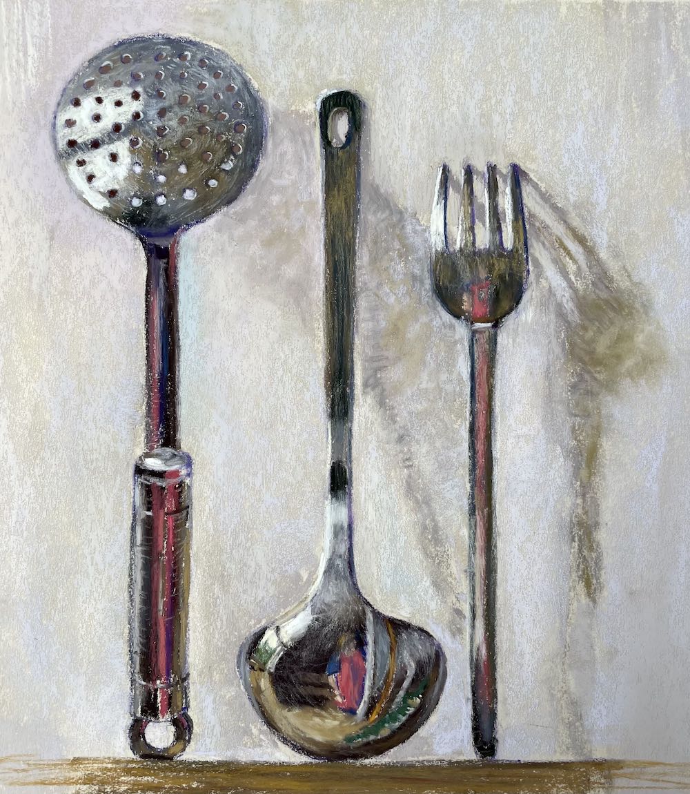 I decided I very much wanted to keep the essence of it being done from life and although there is a reasonable degree of accuracy, from a technical point of view, absolute realism was never my aim. I could have amended the holes to make them more exact and uniform, but deliberately left it as it was because I wanted something more than a technical reproduction of kitchen utensils. Having my own image included in these pieces was a record of them being created and I wanted the physical process and nuances of personal pastel application to become evident in the final image.