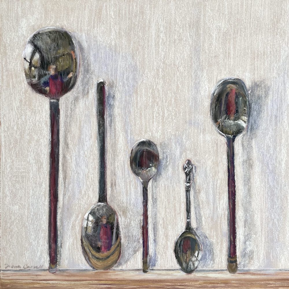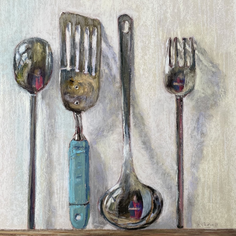 I’m delighted to introduce you to pastellist Fiona Carvell. I can’t remember when I first came across Fiona’s work but I do remember that I was knocked over when I saw her cool ladle and kitchen utensil paintings. I was already familiar with her money plant still life paintings with their intricate relationships between subjects and their cast shadows and which I love. With the appearance of the reflective series, I knew I needed to ask her to be a guest on HowToPastel. And whoo hoo!! She said yes!